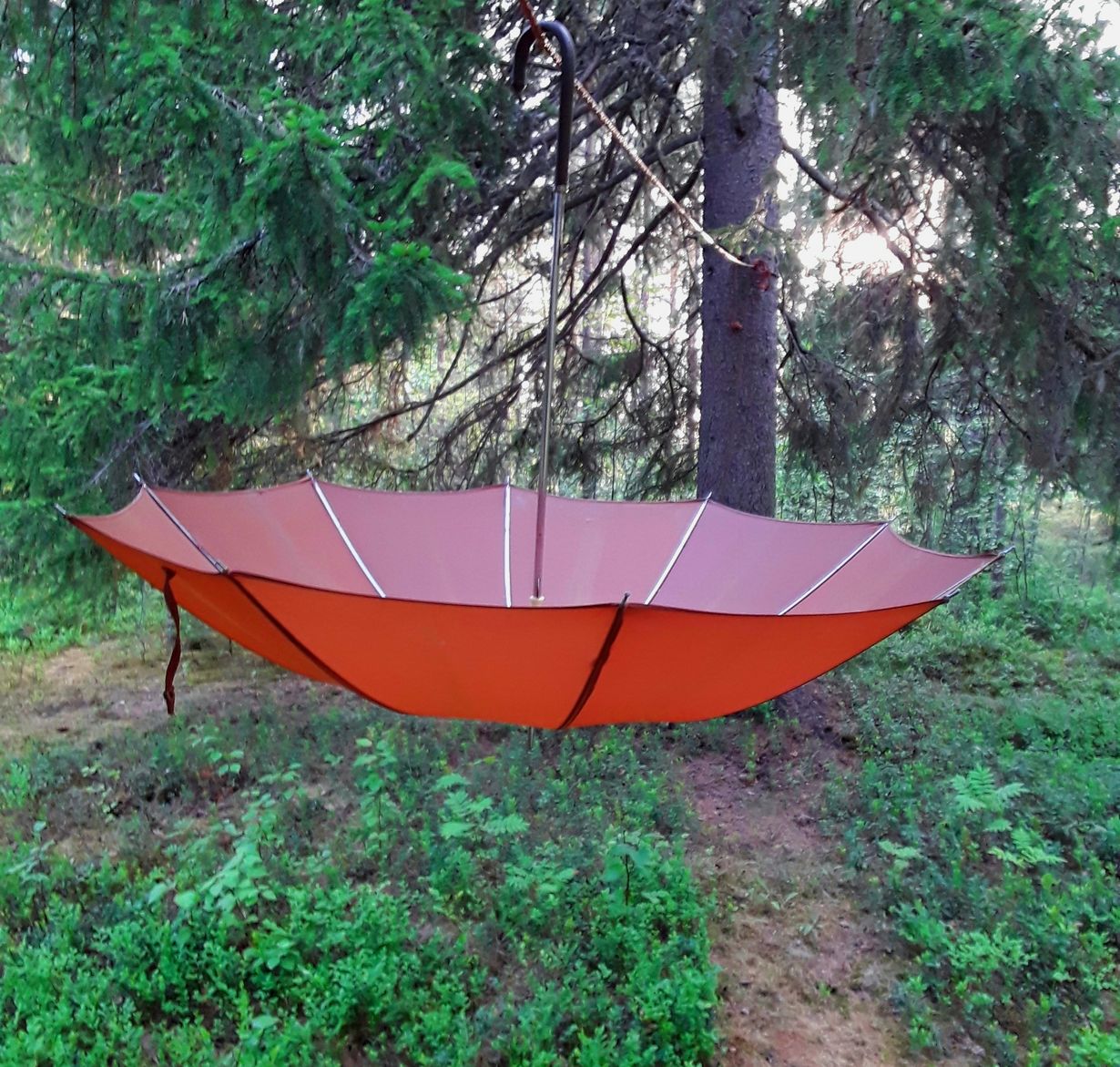 Tämä sateenvarjo on 1960-luvulta. Se suojasi äitiäni sateelta. Se roikkuu lapsuuden kotini eteisen seinällä. Nyt olen sitä hellästi sateessa kantanut. Kauneudellaan Se kantaa joskus auringon säteitä kotikuuseni oksalla.