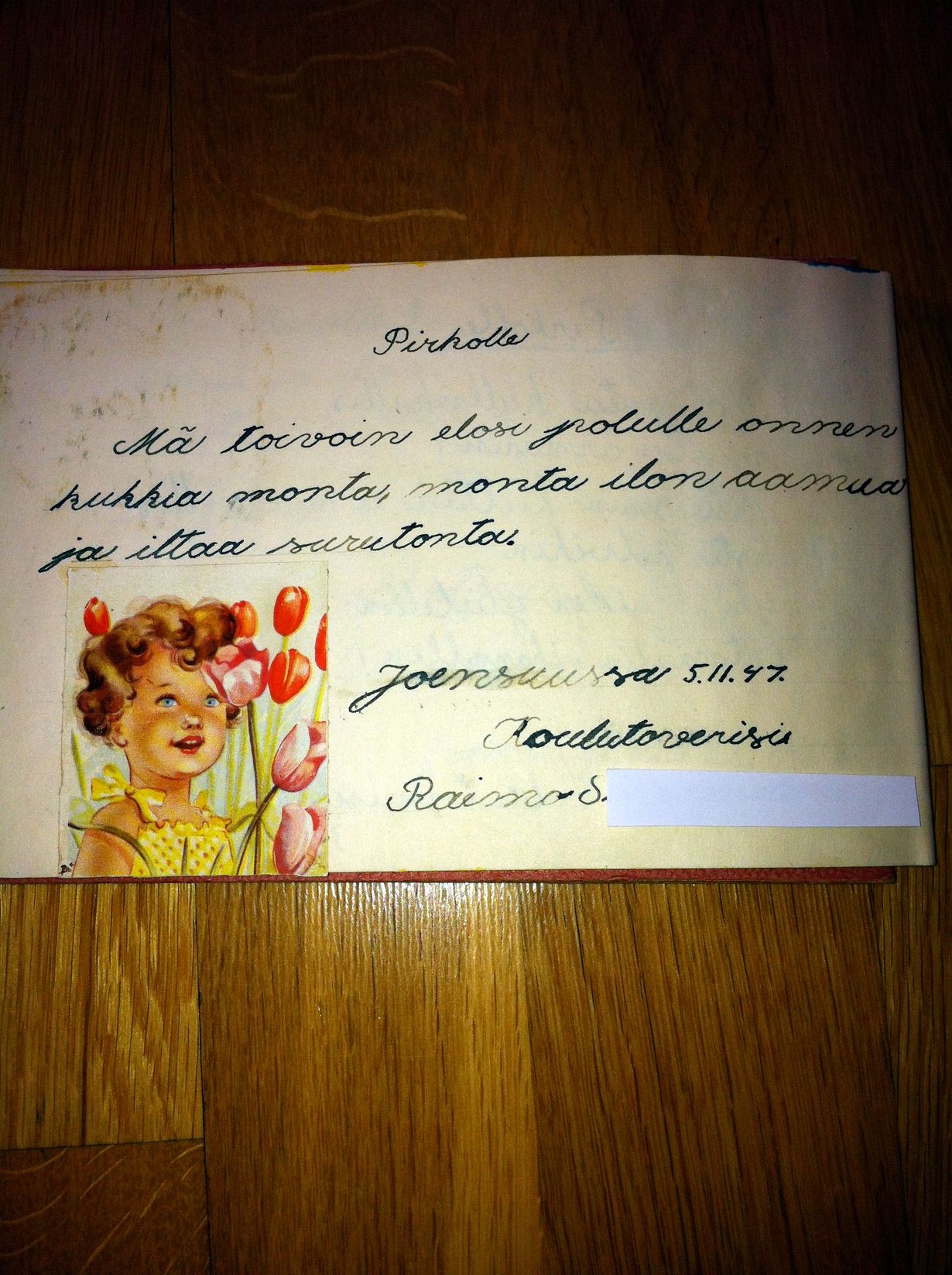 Värssy ja kuva ovat kansakouluajoilta. Siihen aikaan oli kiiltokuvia saatavilla rajoitetusti.