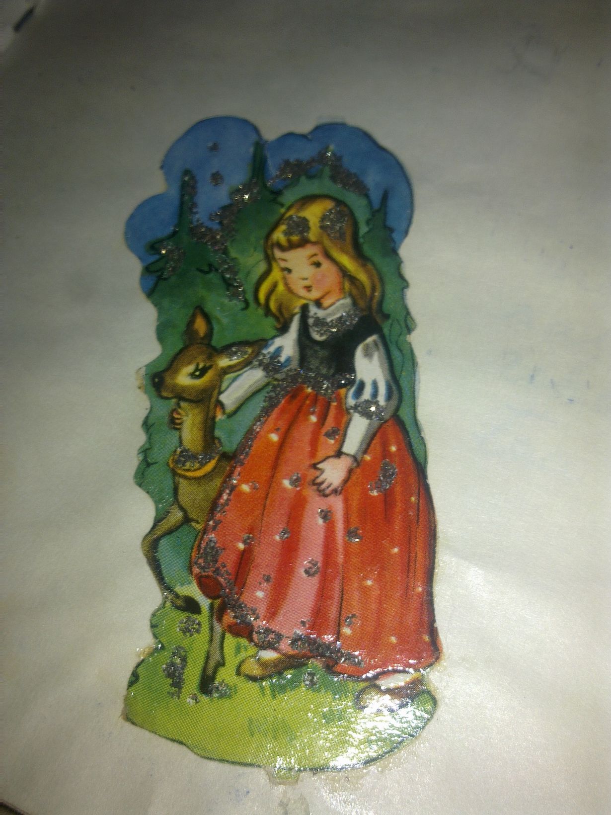 50 luvulla saatuun muistovihkoon liimattu ihana kiiltokuva. Rakastin niitä missä oli välkettä mukana.Vihkoa lukiessa muistelen entisiä luokkatovereita ja opettajia.