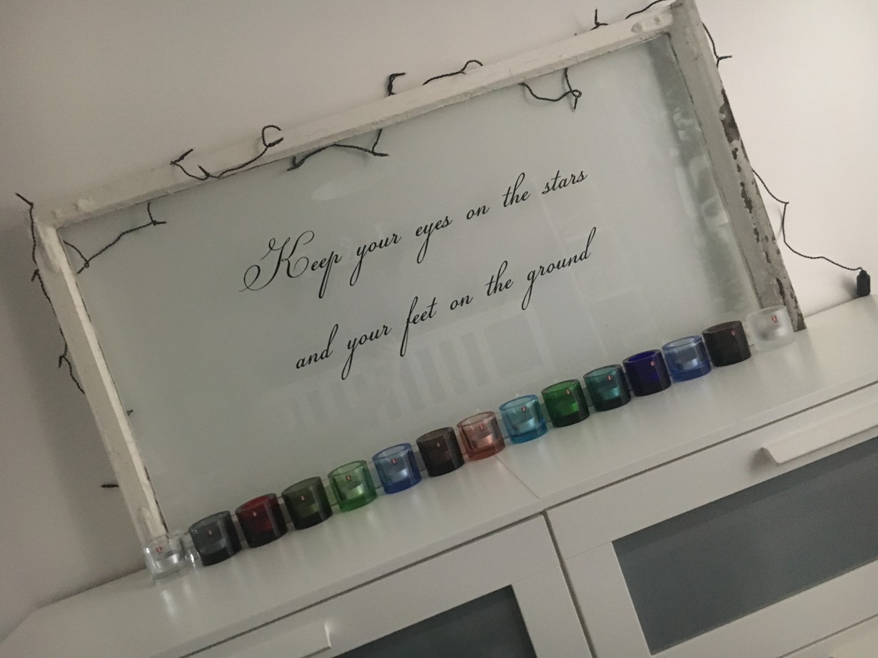 Eli vanhaan ikkunapokaan laitettu teksti "keep your eyes on the stars but your feet on the ground". Eli muistuttaa että aina voi unelmoida isosti mutta jalat täytyy aina olla maassa kaikessa. Hyvä herätä tähän näkyyn joka aamu.