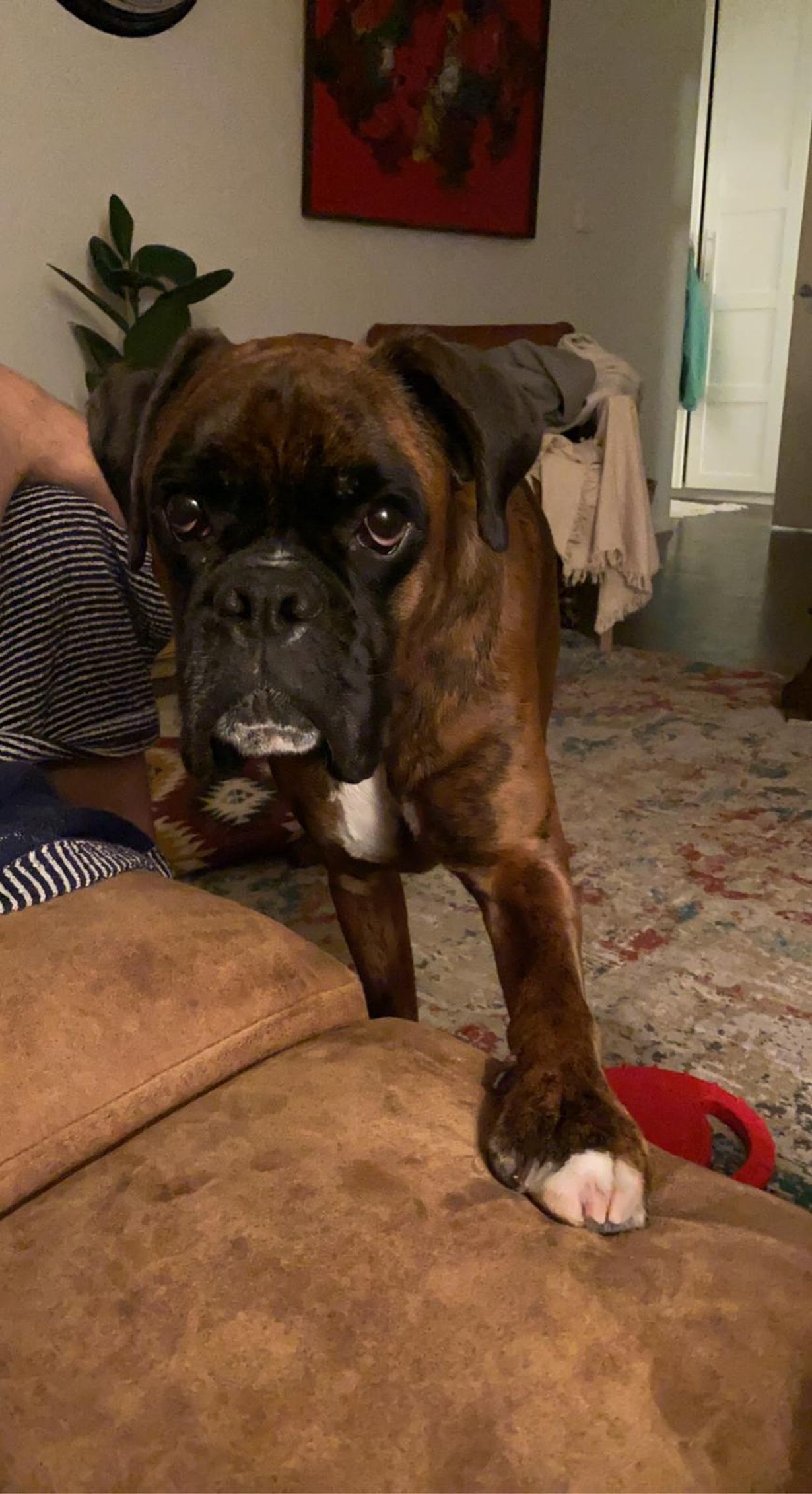 "Syöt selvästi jotain hyvää" - miettii Romeo bokseri ja vienosti kerjää makupalaa