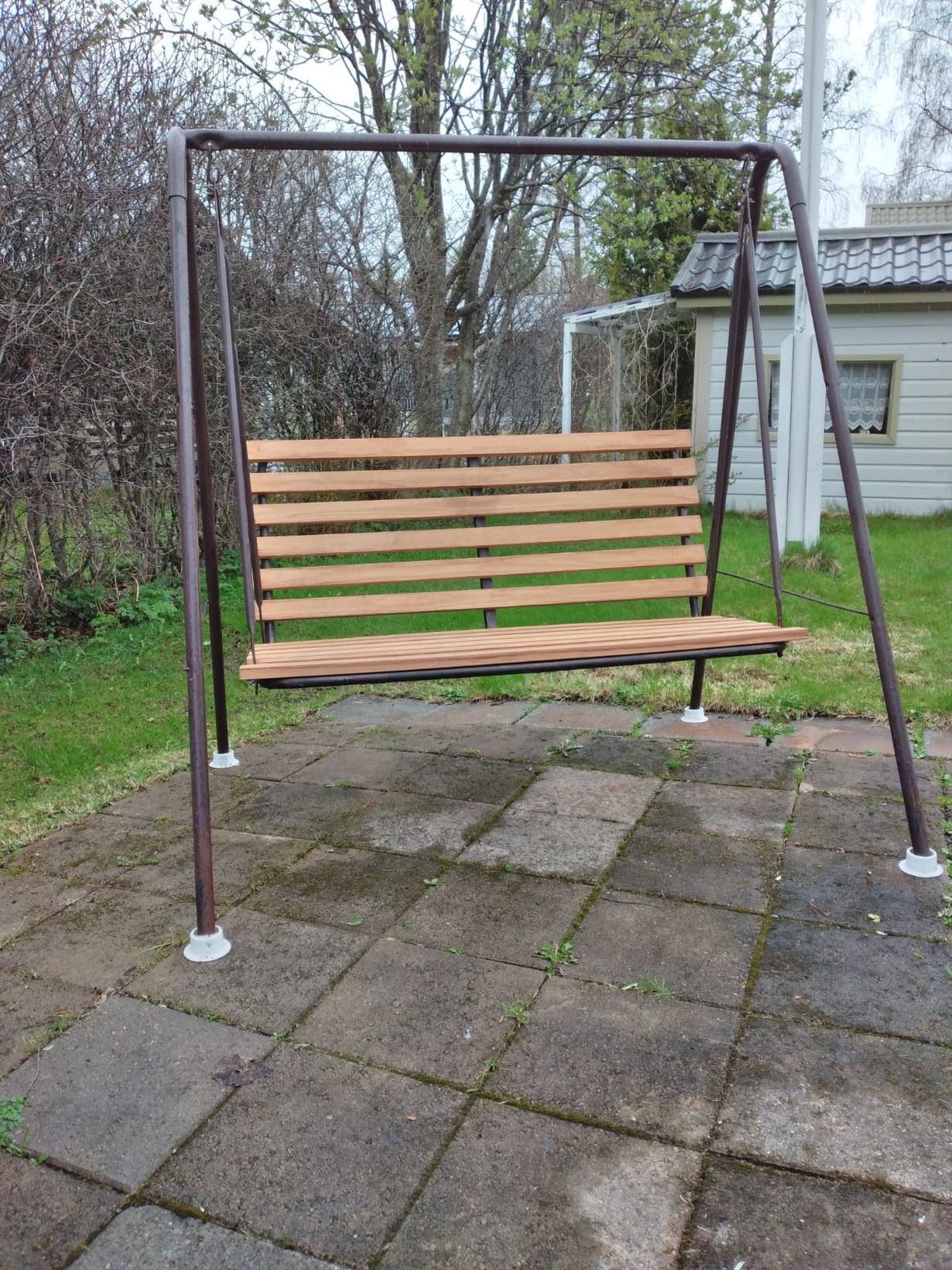 Tällä kahden istuttavalla keinulla on ikää n. 45v. Keinu on ollut ensin isovanhemmilla n 7 vuotta ja sitten meillä 38 v. Keinun istuin kangas alkoi repeytyä tänä keväänä. Emme raskineet hävittää muuten hyvin säilynyttä keinua vielä pois. Siihen laitettiin rimoitus ja nyt se pääsi Mummilan pihalle.