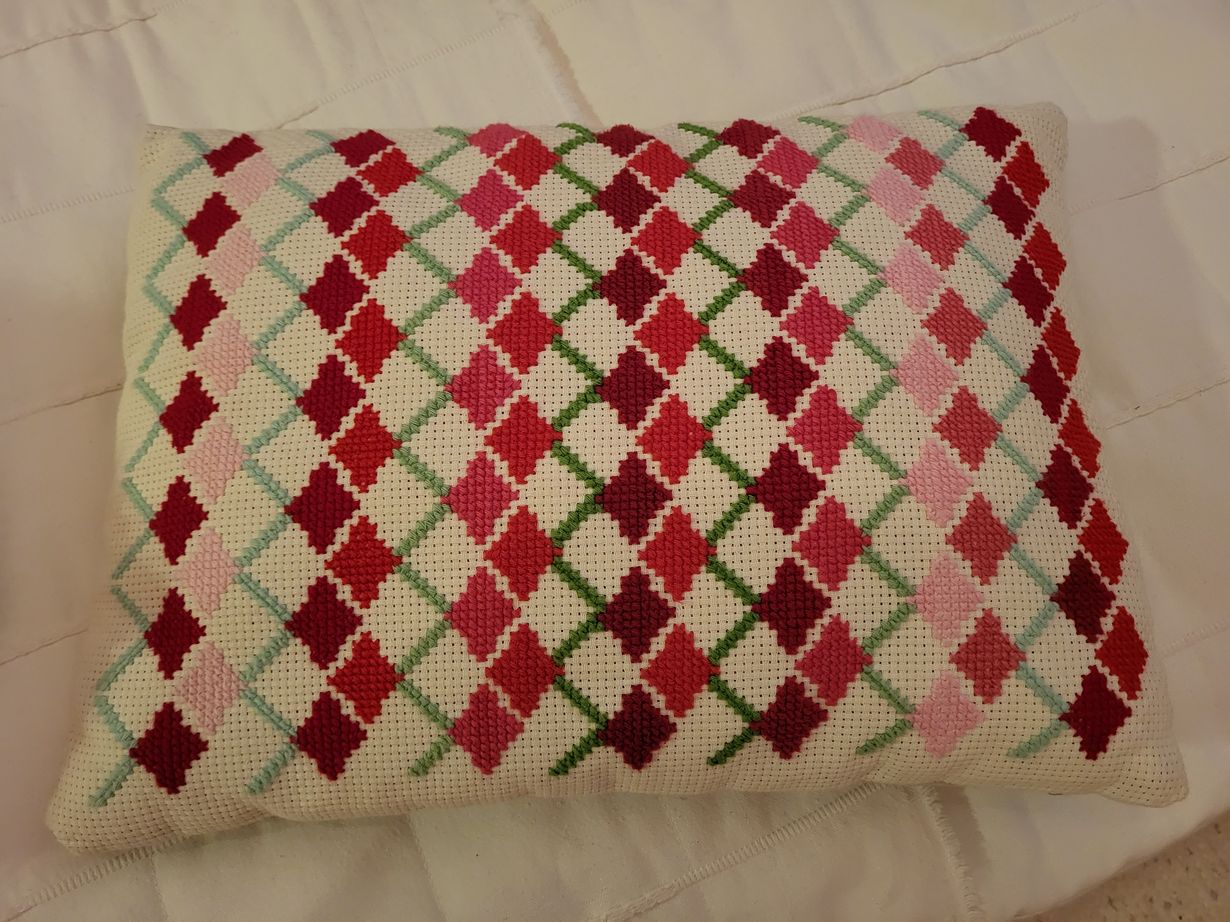 Olen saanut ristipistotyynyn lahjaksi äidiltäni, joka oli oikea käsitöiden taitaja. Tyyny on tehty 2000-luvun alussa. Tyynyn langat ja kuvion ja värien sommittelun hän teki itse ilman mallia. Muistan nyt jo poisnukkuneen äitini aina tyynyä katsellessani. Kiitos Äiti!