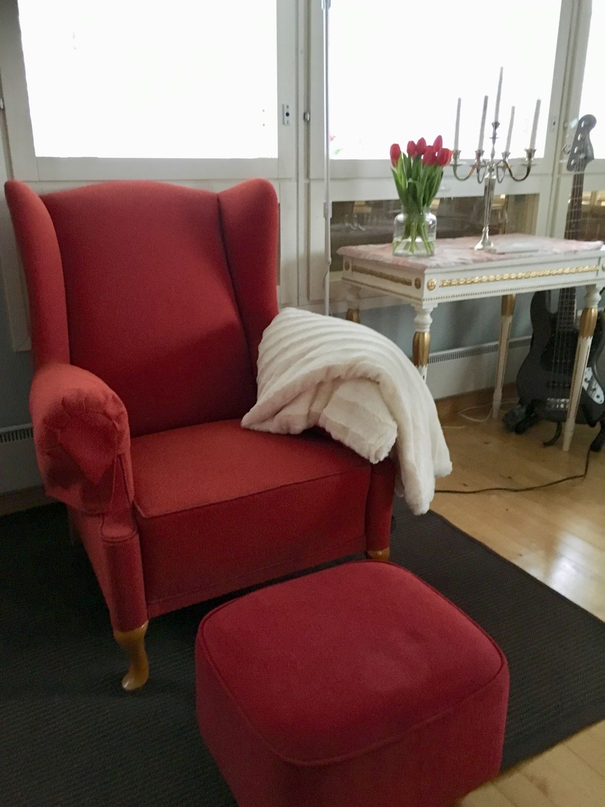 Mummolan salissa oli lapsuudessani tämä ihana nojatuoli, jossa on mukava lueskella tai ottaa vaikka nokoset. Päällystytin tuolin iloisella punaisella verhoilukankaalla ja nyt tuoli on kaupunkikotimme olohuoneen piristys.
