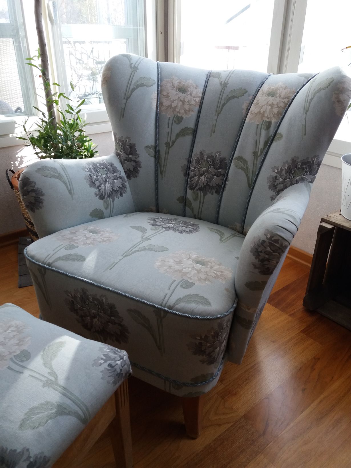 Mummolta minulle!Vietin lapsuudessani paljon aikaa Oili mummon luona Nokialla.Ihailin aina mummon kaunista vaaleanruskeaa nojatuolia,jonka päällä pidettiin suojakankaita,sen ajan tapaan.Nojatuoli on muodoltaan kaunis ja siinä on tosi hyvä istua.Mummon perintönä nojatuoli kulkeutui minulle ja se päivitettiin verhoilijalla Laura Asley kankaalla!Tuoli on ollut rakas olohuoneemme "kukkanen"jo 25 vuotta.