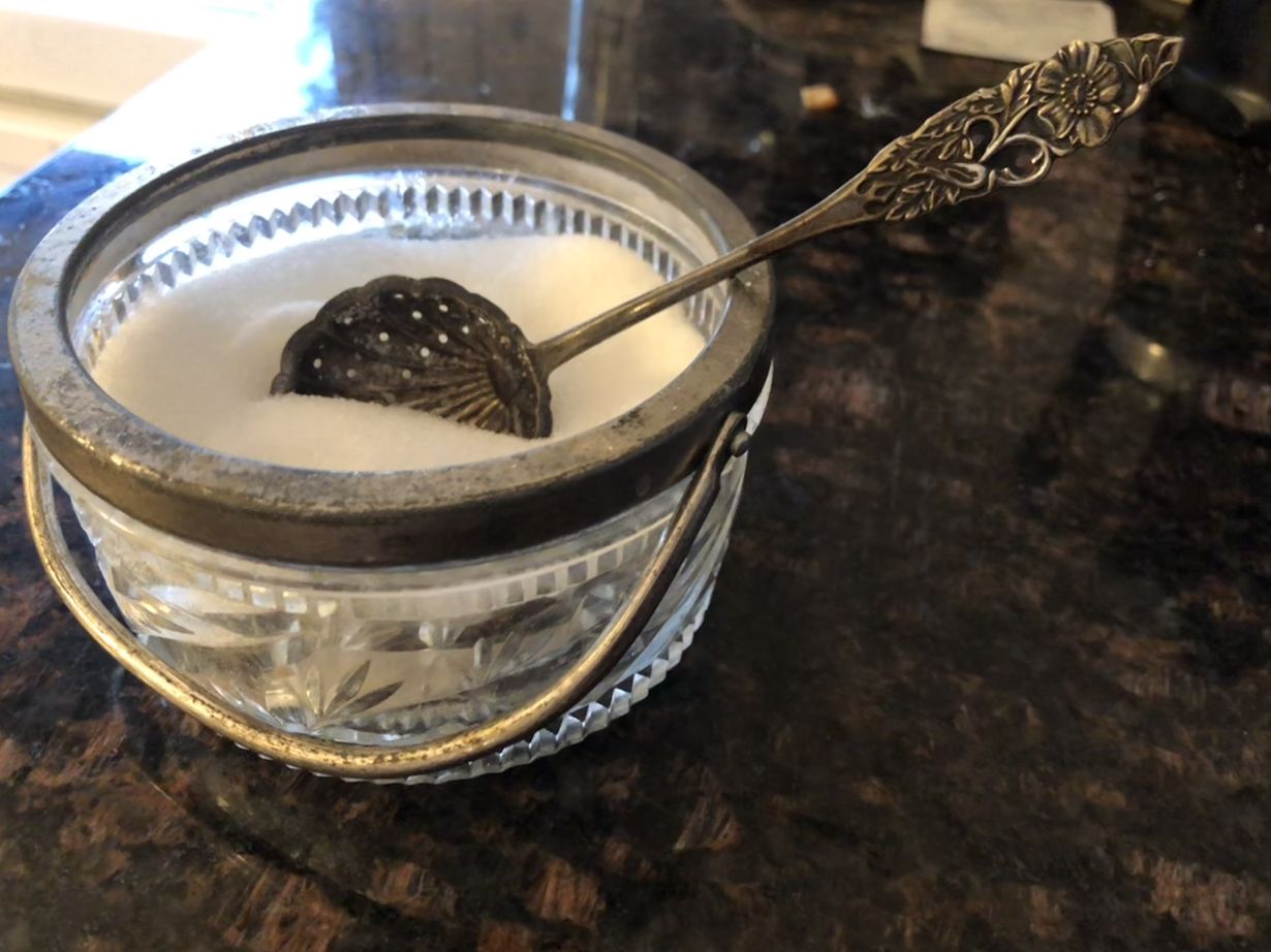 Sain sokeriastian ja lusikan perintönä mummolta ja papalta. Myös heillä oli siinä aina hienoa sokeria. Kun mummo kuoli 93-vuotiaana jaomme veljeni vaimon kanssa hänen astioitaan. Veljeni vaimosta sokeriastia oli ruma, minulle astia tuo aina mieleen hetket mummon ja papan keittiössä.