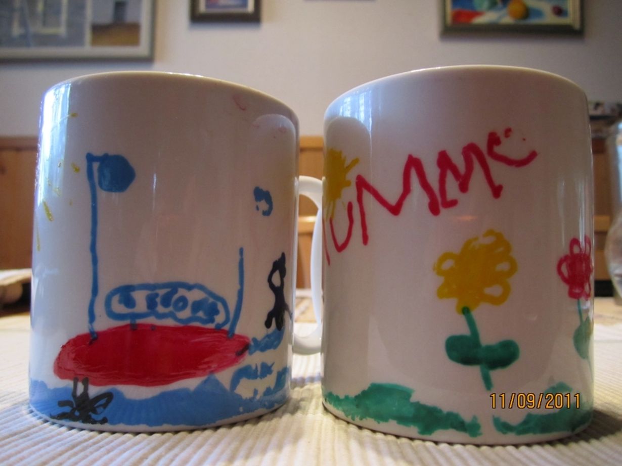 Sain äitienpäivänä 2008 kuusivuotiaan lapsenlapsen taiteileman mukin jonka kuvat on jokapäiväisessä käytössä jo vähän kuluneet, (mummon kuvasta puuttuu jo pää) vaikka on käsitiskissä neuvon mukaan tiskattu, ukki sai omansa isänpäivänä 2008 ja siinä on hieno ukin purjevene ja ukki peräsimessä. Kahvi ja tee maistuu näistä erikoisen hyvältä.