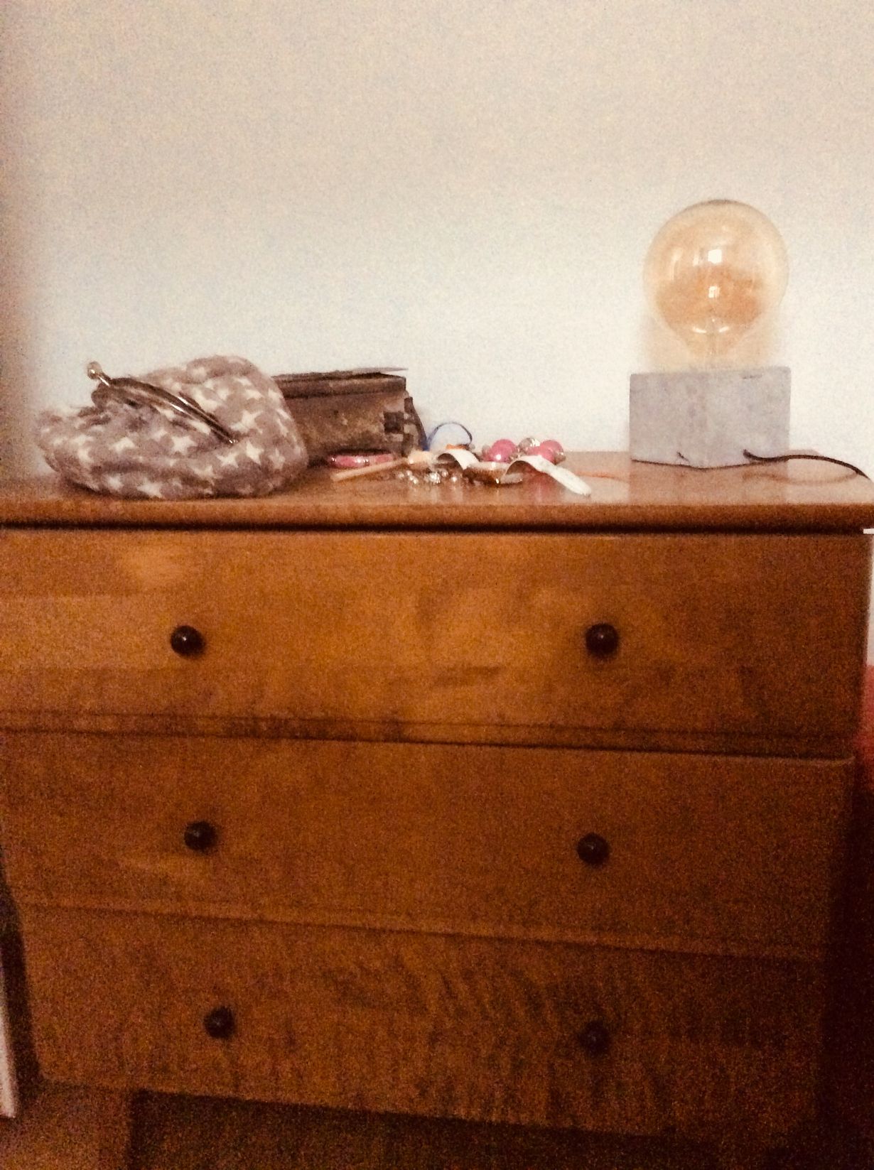 Yöpöytänä toimii isoäidin vanha koivulipasto, josta en luovu, vaikkei ikinä muuhun sisustukseen kävisikään. Piilottaa alusvaatteet sisäänsä, tilaihme.