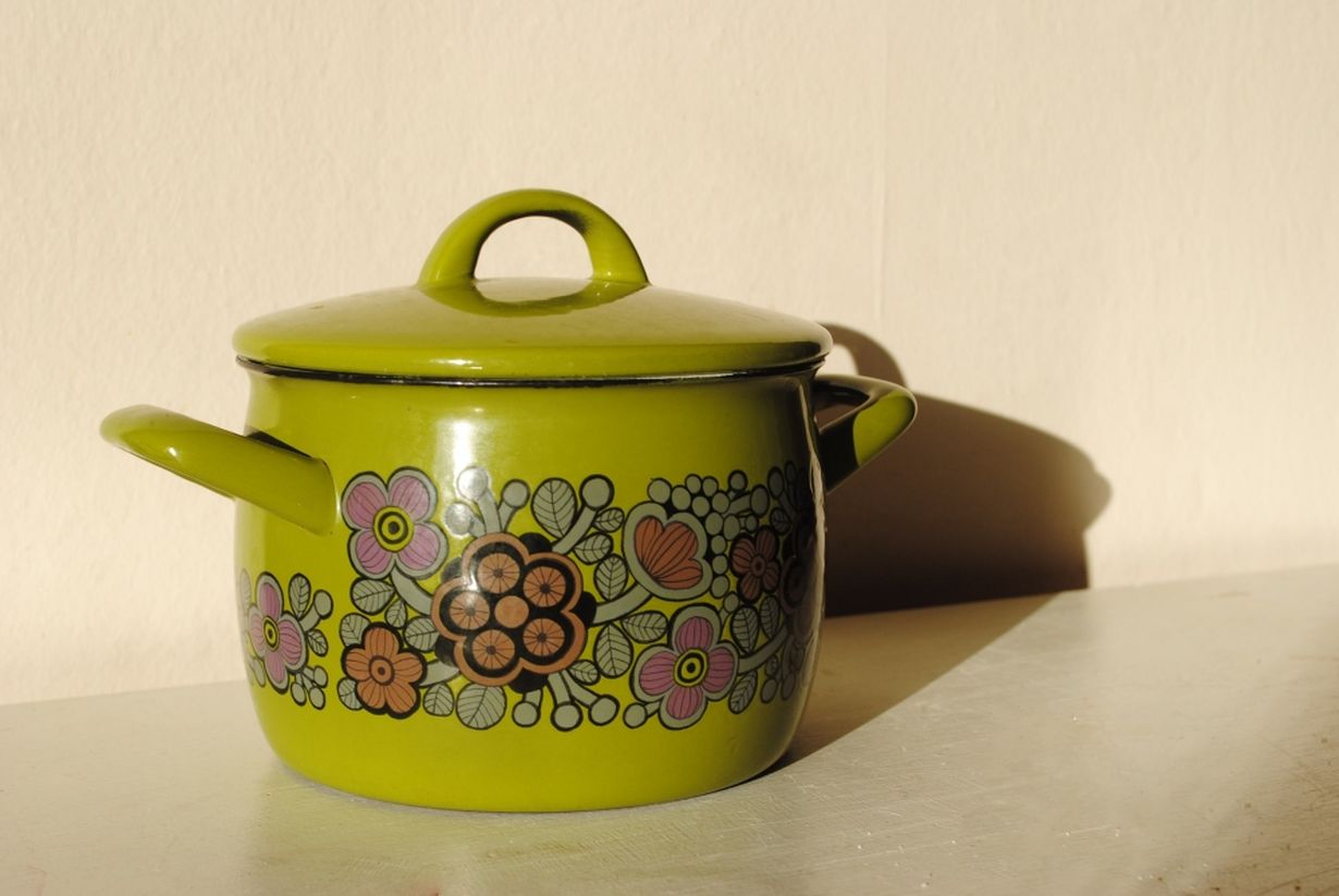 Muutimme syksyllä siskoni kanssa opiskelija-asuntoon ja saimme mummolta tämän kattilan täydentämään niukkoja astiavarojamme. Mummo on ilmeisesti 1960-luvlla saanut kattilan äidiltään lahjaksi ollessaan vastavihitty ja perustaessaan omaa kotia. Sillä on keitetty aikanaan monet sopat. Meillä on käytössä pasta- ym. kattilana ja hyvin keittää.