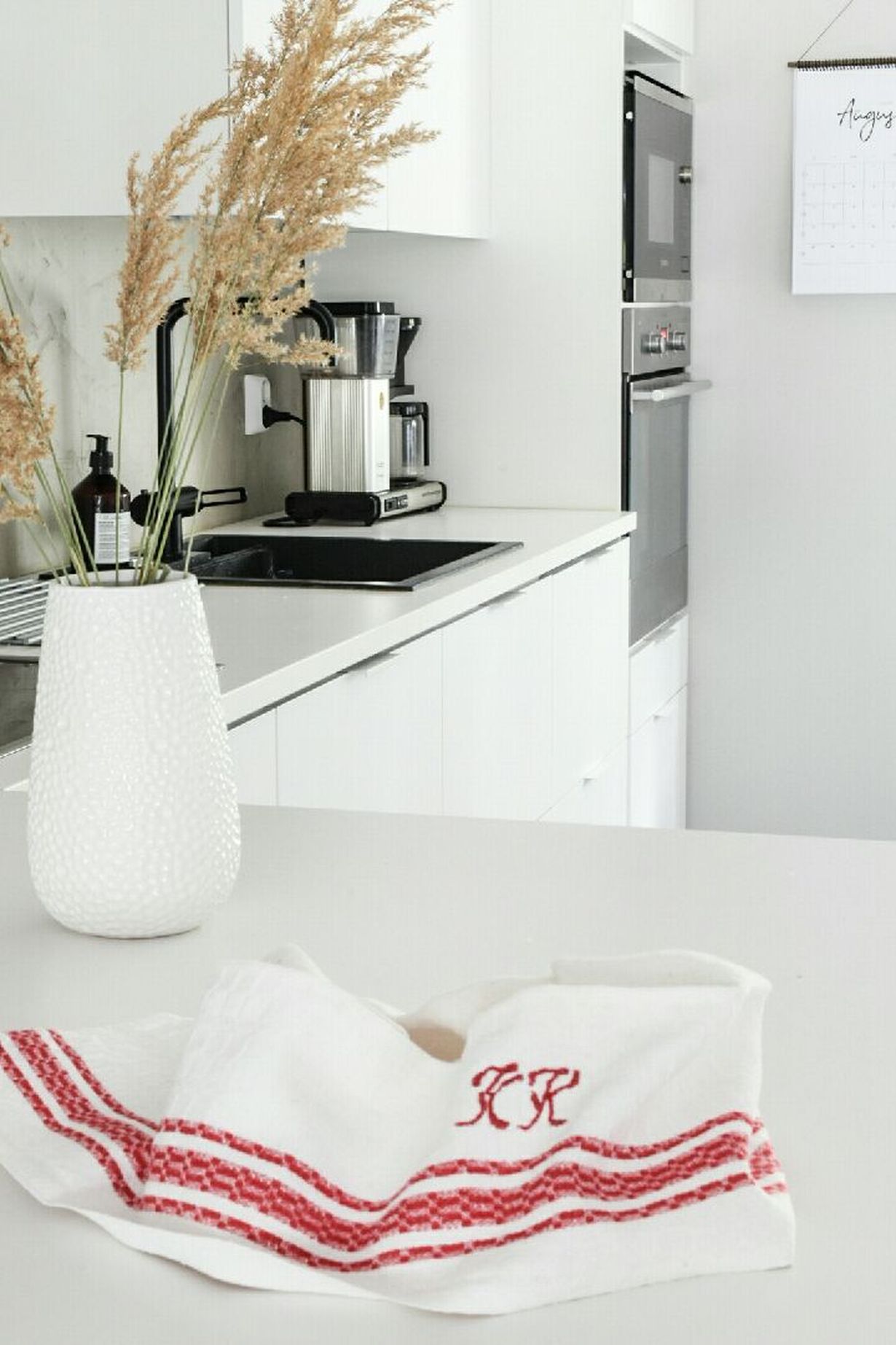 Tässä meidän keittiöpyyhkeet. Mummuni tekemät ja kirjailemat. Mummuni kirjaili uudet nimikirjaimet, KK mentyään naimisiin vuonna 1938. Pyyhlkeet ovay edelleen kuin uudet ja meiltä löytyy näitä kymmeniä. Sopivat hyvin meidän moderniin keittiöön ja lisäksi näissä on minun nimikirjaimet myös