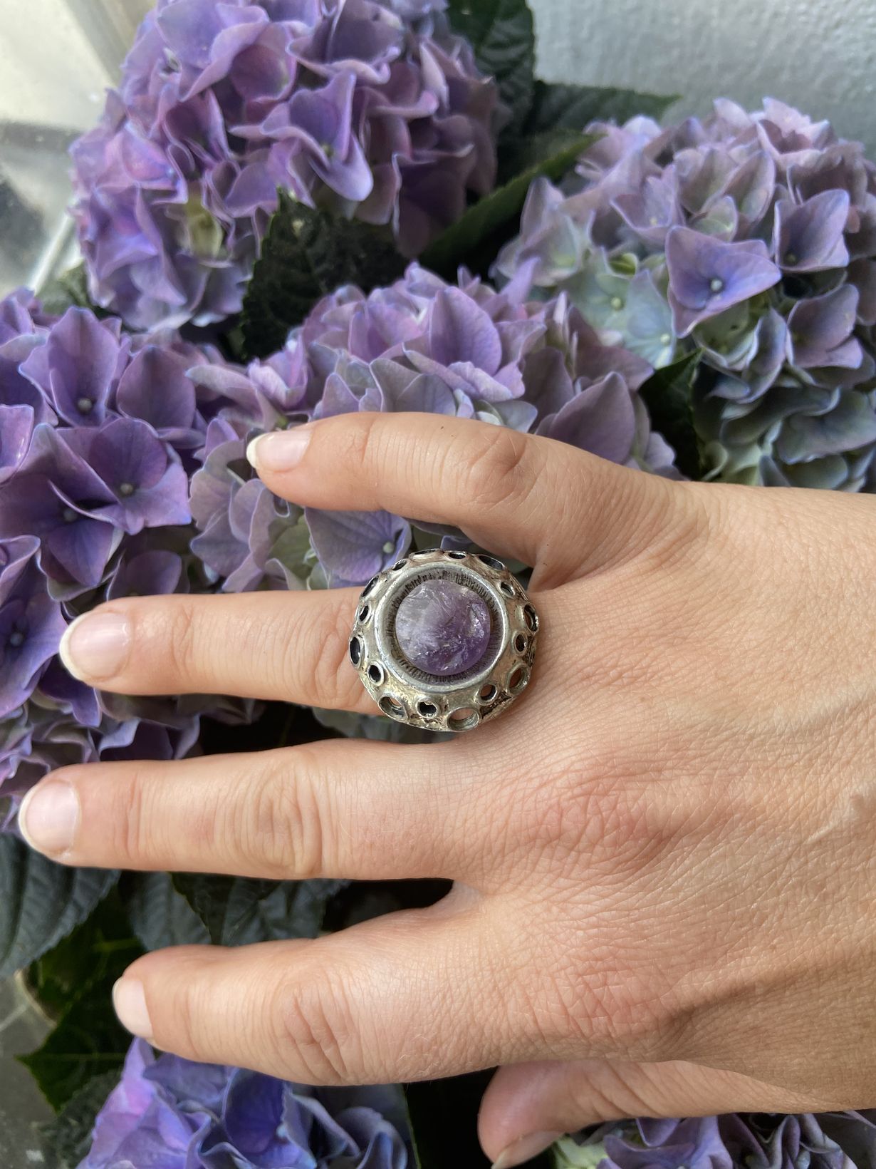 Olen vuosikymmeniä sitten saanut nyt jo edesmenneeltä mummultani sormuksen, jossa on iso lila kivi. Sormuksen käyttöönotto on varma kesän merkki, se kun ei hansikkaiden alle mahdu.