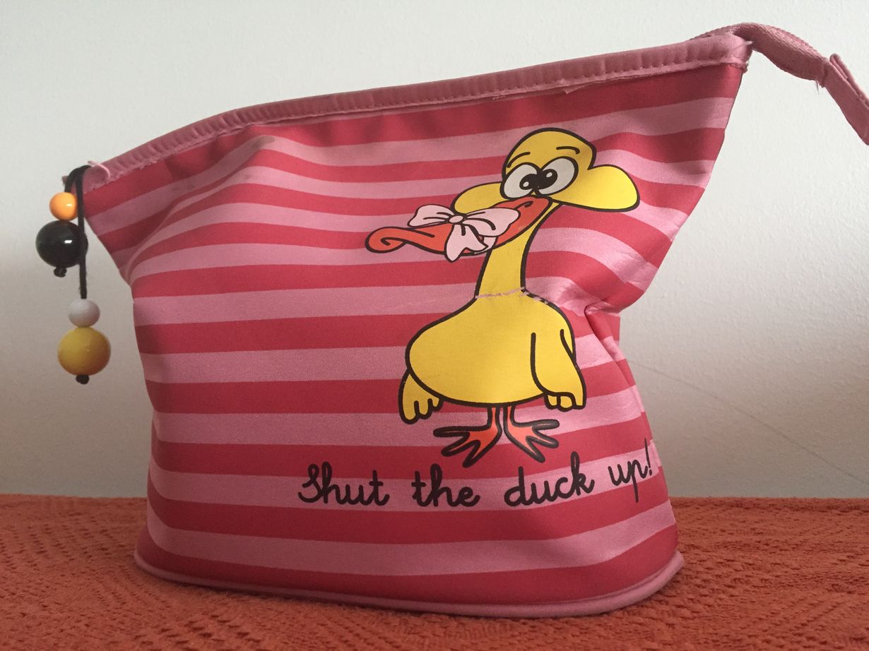 Sain meikkipussin vuosia sitten tyttäreltäni. Onkohan teksti tyttären toive äidille??? Nimi ja kuva taitaa kuvata omistajaansa. Nokka tukkoon-meininki saattaisi joskus olla jopa suotavaa. Niin ihana pussukka, siellä kaikki tarpeellinen. Ja se tarpeetonkin. Aina mukana, kulkenut matkassa vaikka ja missä...ja vuosia vielä saa kulkeakin. En luovu siitä!