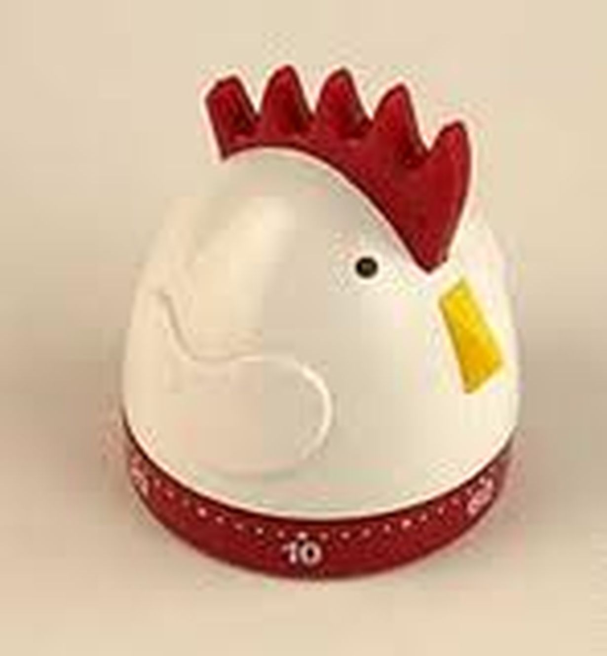 Alaosassa kelloajastimen rengas, tuntiin asti voi vetää. Voimakas terävä hälytysääni, ei onneksi kuiteskaan kotkotus!