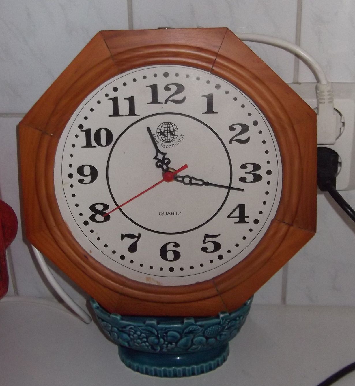 Tämä kello on ostettu Leppävaaran MAXI-marketin jostain erikoistarjouspöydästä 1990 luvulla 5 mk:lla. Se oli jo koviakokenut, mutta koneisto toimii hyvin. Lasi hajonnut eikä seinälläkään pysy. Munien keittoajan näyttää hyvin.