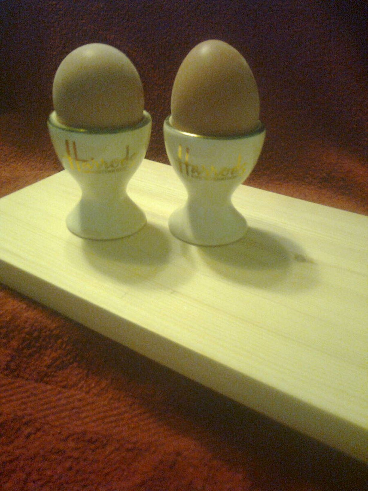 Virallistimme liki 30 vuotta kestäneen yhteielomme kesällä 2008 maistraatissa ilman sen kummempia juhlalisuuksia tai kekkereitä. Sisareni kuitenkin oli ollut sitä mieltä, että"pitäähän niille joku häälahja keksiä" ja antoi meille nämä munakupit, joissa lukee kultakirjaimin Harrods. Kuulema ne olivat kirppislöytö Tukholman matkalta!