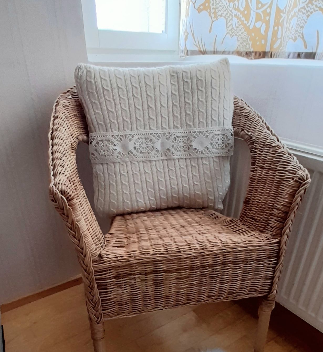 En ole itse kovin kätevä käsistäni, mutta tein tyynyn äidin kutomasta vanhasta villapaidasta, ja somistin sen isoäidin virkkaamalla pitsillä.