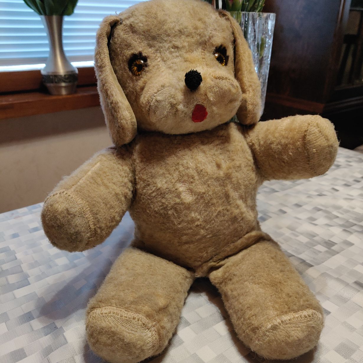 Muisto lapsuudesta, vain selässä ollut soittorasia on operoitu, muuten "nalle" on alkuperäisessä kunnossa. Olen pitänyt sitä aina nallena, vaikka ei se taidakaan olla.
