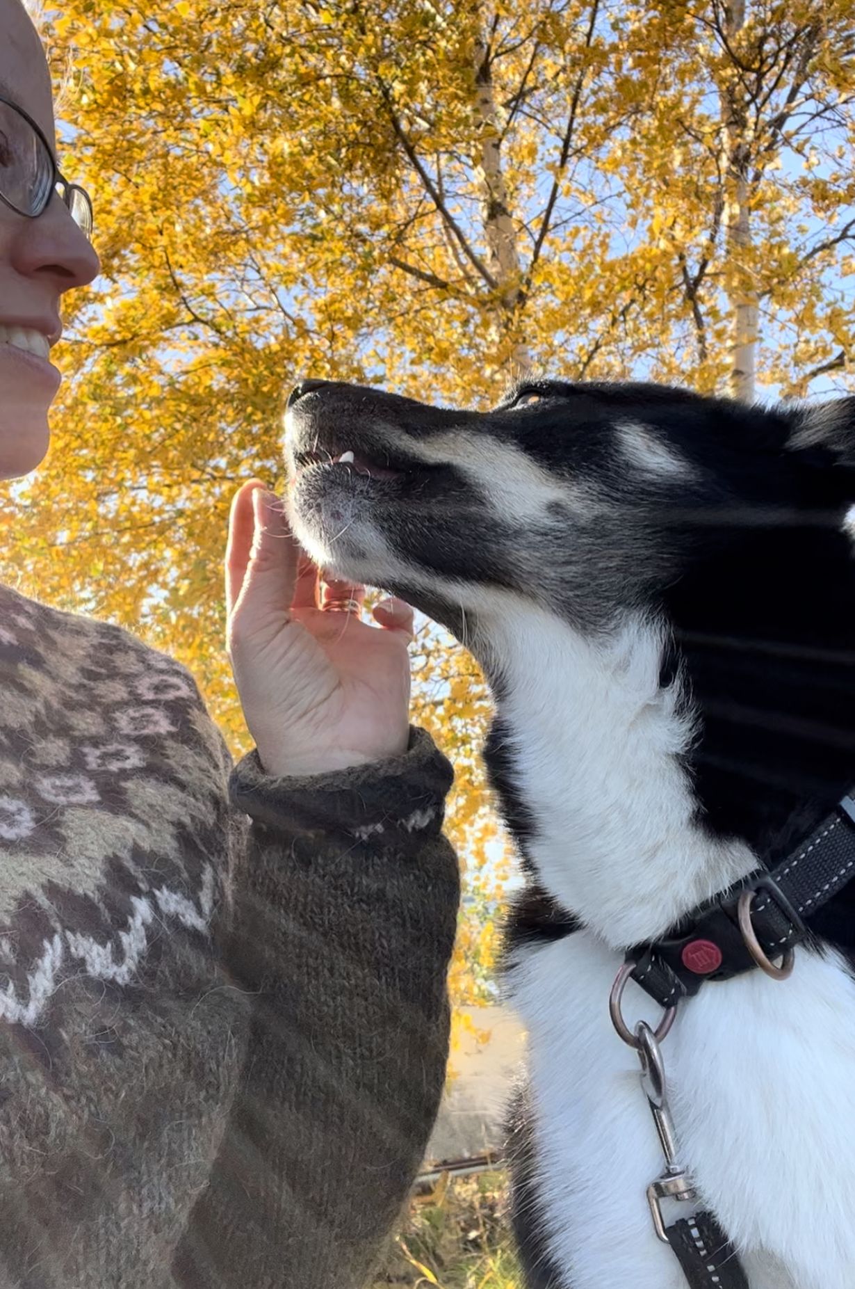 Lapinporokoira Muru on kumppanini kaikessa. Tässä istumme nuotiopaikalla syksyisen Kyrkösjärven rannalla ja herkuttelemme. Muru hyppäsi penkille viereeni haaveilemaan ja katselemaan järvelle.