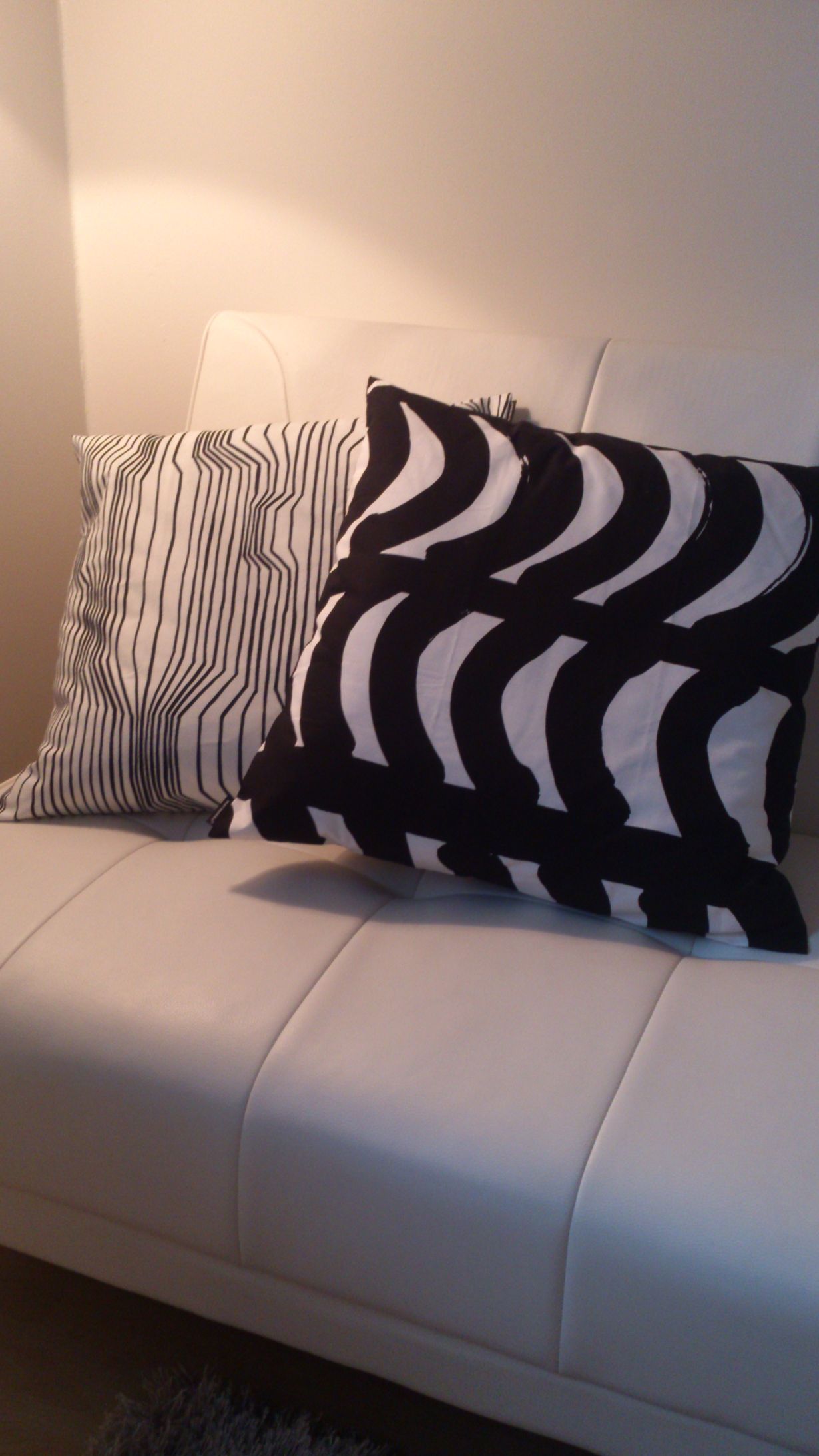 Nämä Marimekon tyynyt ovat löytäneet paikkansa vierashuoneemme sohvalta. Koko huonetta kantaa mustavalkoinen teema.