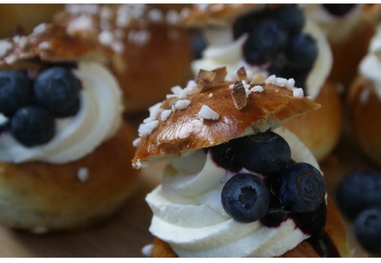 Pensasmustikoilla ja kermavaahdolla täytetyt pikku laskiaispullat.