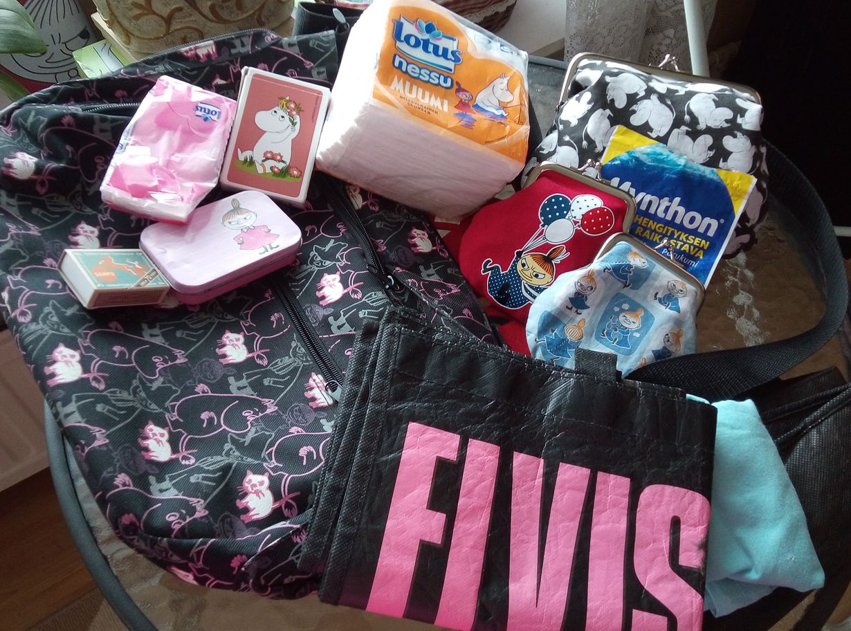 Muumi-intoiluni näkyy laukussa ja sen sisällössä, kuvasta puuttuvat vielä yhteen taskuun unohtuneet pari kynää, Muumia, kuinkas muutenkaan.
