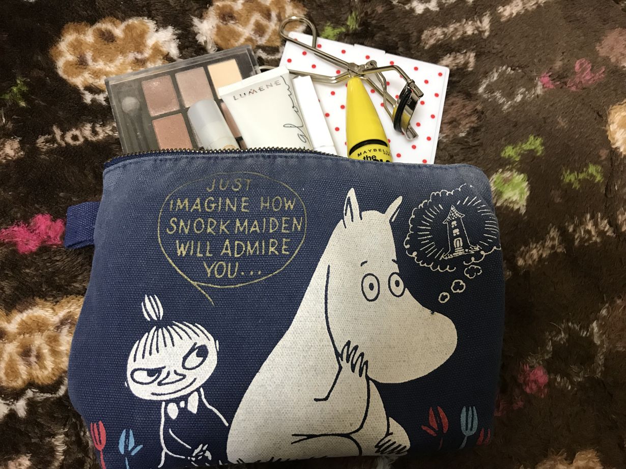 Muumimaisesta meikkipussistani löytyy nykyään aika kevyt kattaus meikkejä: setti luonnollisen värisiä luomivärejä, Lumenen kevyt Glow Foundation aurinkosuojalla, musta ripsiväri, valkoinen alusripsiväri (auttaa ripsaria pysymään paikallaan & tekee ripsistä näyttävämmät, japanilaista KATE-merkkiä), huulirasva ja ripsentaivutin. Viime aikoina on tosin tullut monesti ulkoiltua ihan täysin ilman pussin sisältöä - ja pakko sanoa, että kyllä tuntuu hyvältä olla ihan puhtaalla naamalla, kun on viimeiset 10 vuotta laittanut joka päivä vähintään pohjameikin. Pussukka on kuitenkin niin ihana, että pakko aina välillä meikata kuitenkin. :')