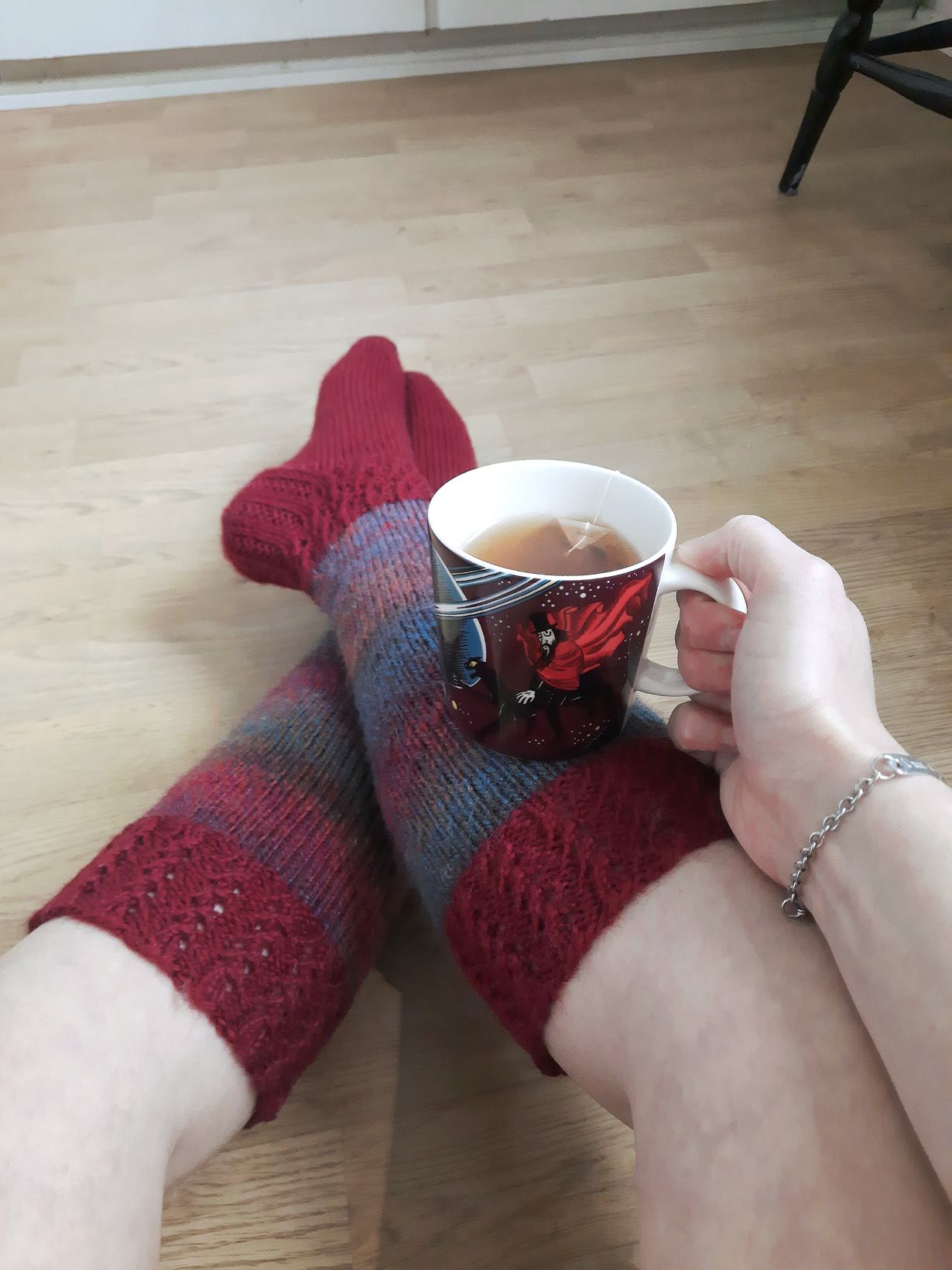 Kuvassa on itse neulomani villasukat ja muumiteetä muumimukissa