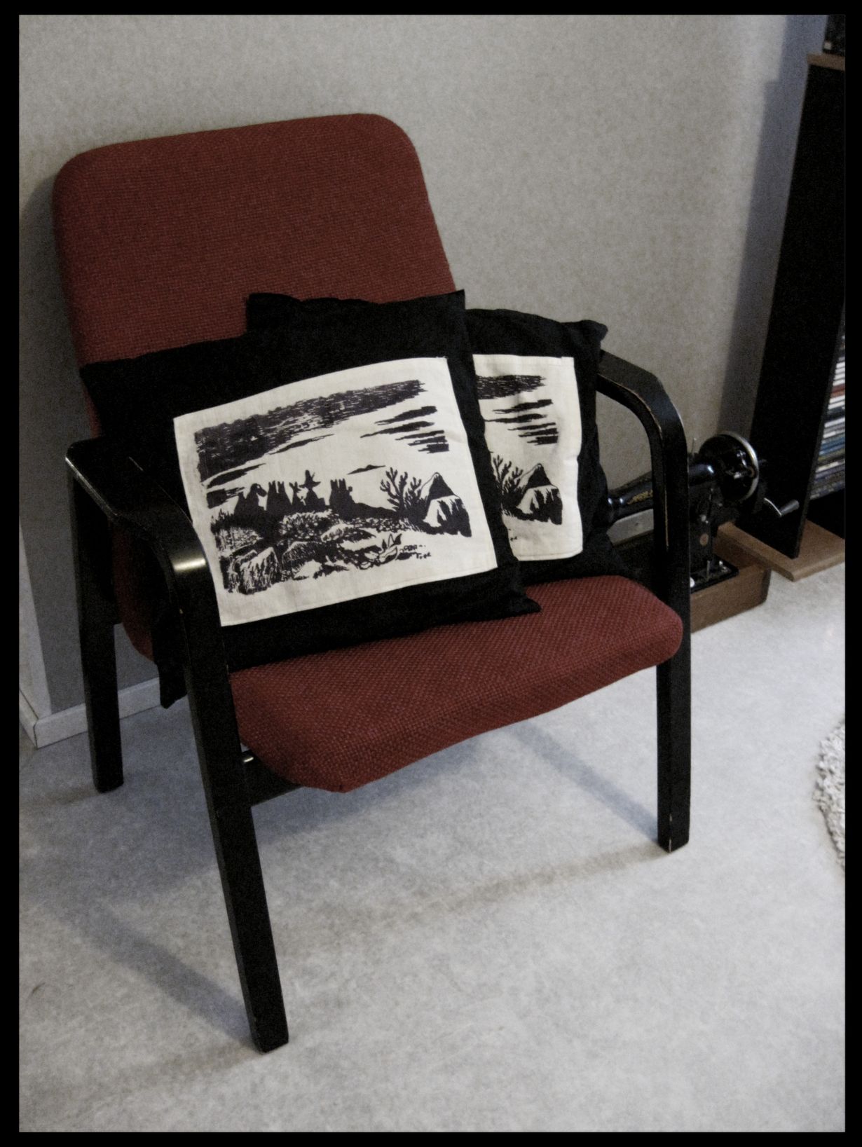 Pikkusiskoni teki minulle ja miehelleni muumityynyt joululahjaksi. Tyynyt ovat alusta loppuun itsetehdyt: kuvan suunnittelusta ja painatuksesta aina liinojen ompeluun asti. Nämä ovatkin arvokkaimmat omistamani koristetyynyt :)