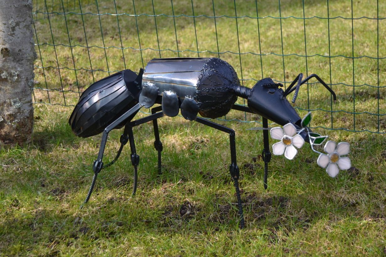Oman piirroksen mukaan tutun metallimiehen tekemä jättiläis muurahainen. Maalattu metallinhohto vihreällä.Murkku on napannut suuhunsa pari tiffany kukkasta.