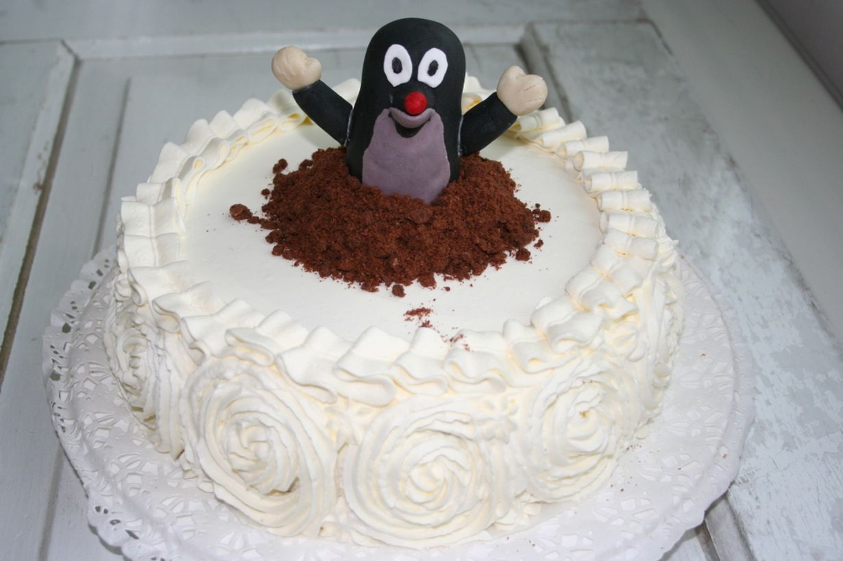 4-vuotias poikani on pienestä pitäen tykännyt Myyrän seikkailuista niin kirjoina kuin piirrettyinäkin. Maaliskuussa 2012 tein hänelle tämän syntymäpäiväkakun. Sokerimassasta muotoilemani myyrä kurkistaa keksimurukasasta. Täytteenä kakussa vadelmahilloa, rahkakermaseos, sekä vadelmaa.