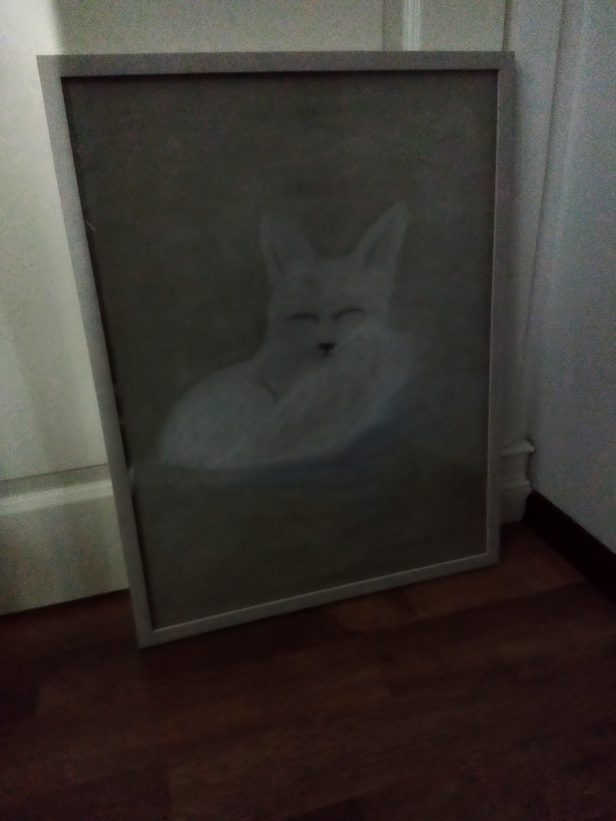 Naalin päiväuni odottaa seinälle pääsyä. Pitkäaikaisen sairastelun takia lapselle lohduksi tilaustyönä teetetty teos lapsen lempieläimestä.