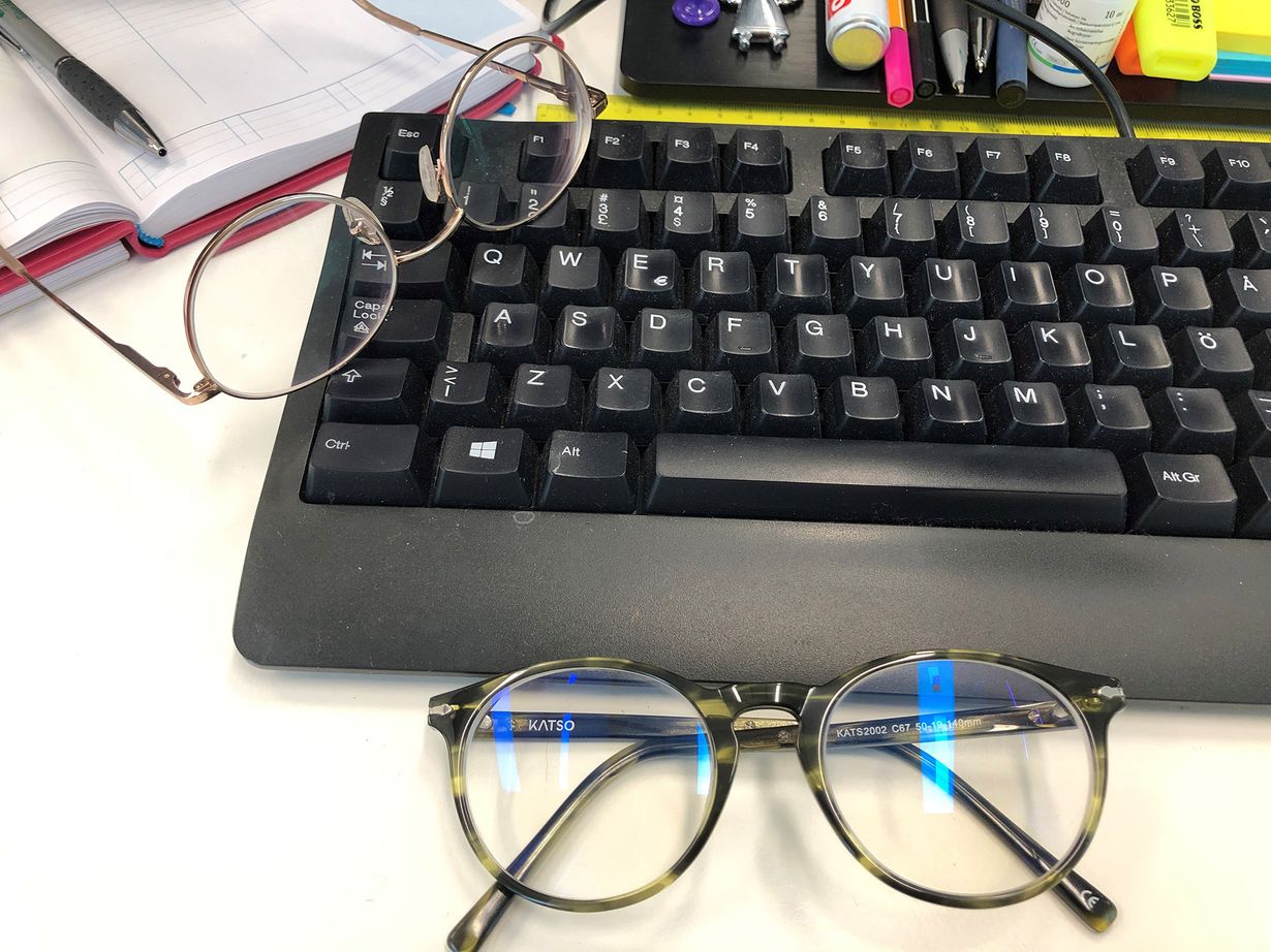 Tärkeät apulaiseni: näppiksellä lukulasini, joita ilman niskani menee tilttiin pitkien työpäivien aikana, takana "perusrillini". Joskun lähden töistä kotiin lukulasit päässä ja viimeistään autossa huomaan virheeni: lukulaseilla näen huonosti ajaa autoa.