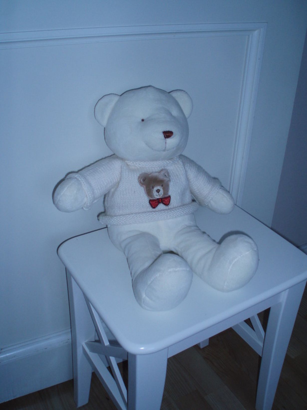 Ostin tämän nallen itselleni vuosia sitten lohdutukseksi kun elämässäni oli vaikea aika. Nyt nuo vaikeudet on voitettu ja tuntuvat jälkeenpäin jopa vähäpätöisiltä. Nalle oli jokatapauksessa onnistunut hankinta. Tänä syksynä neuloin nallelleni tämän sisustukseeni sopivan valkoisen villapaidan.