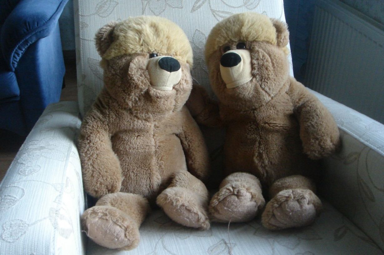 Ostin kymmenisen vuotta sitten kaverukset kirppikseltä. Nallet ovat samankaltaiset, mutta ilme erilainen. Niitä katsellessa tuntuu kun ne haluaisivat kertoa jotakin. Monesti näyttää, että toinen on äiti ja toinen lapsi. Taas joskus ilmeet on ilkikuristen poikaviikareiden. Mitähän on yön pimeydessä puuhailtu.Keinutuolissa istuessaan valtaavat talon mukavimman istuimen, mutta ...... no antaapa heidän siinä ollakin.