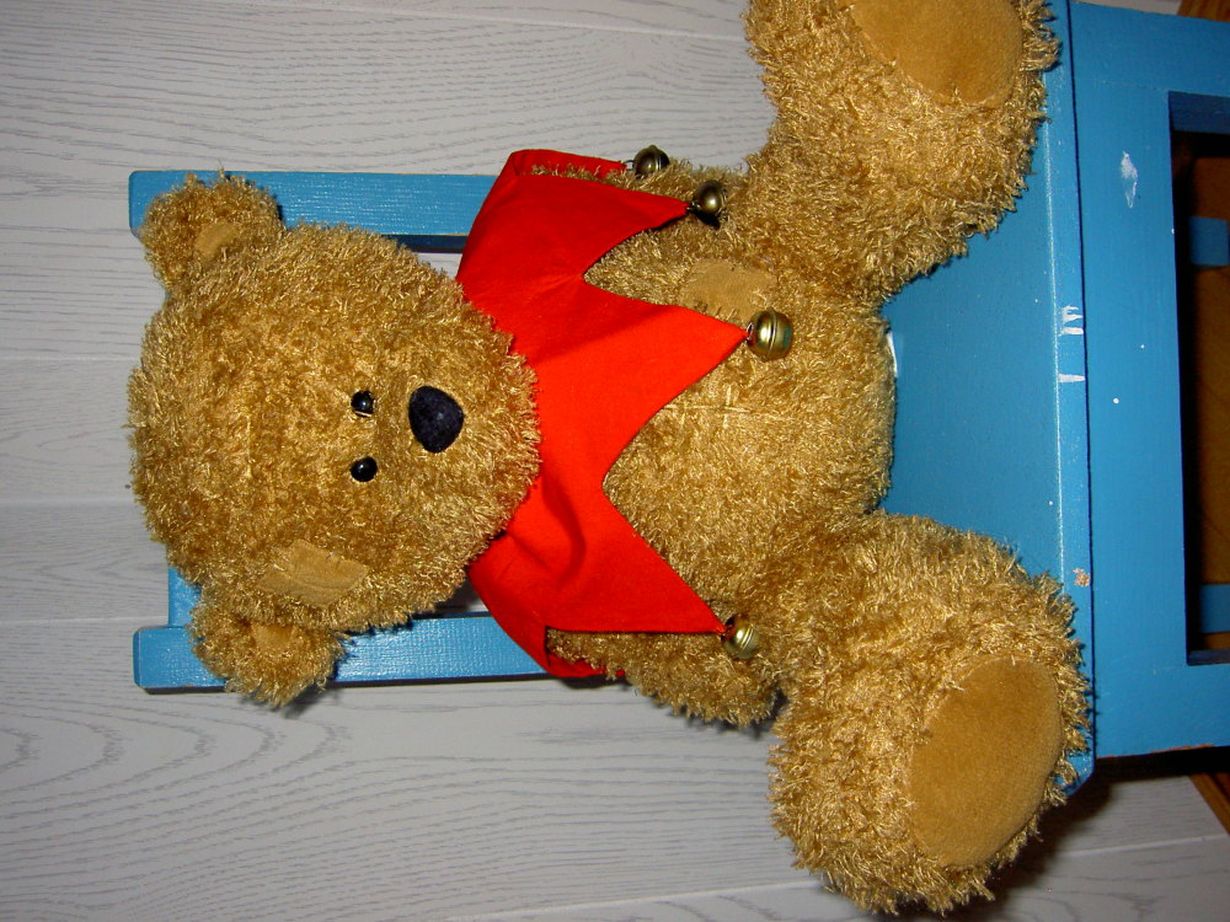 Kuvassa istuu yksi aarteistani, jonka olen saanut tuliaisina Ruotsita. Jouluksi nalle saa kaulaansa kulkuskaulurin, jota tytär pikkuisena käytti.