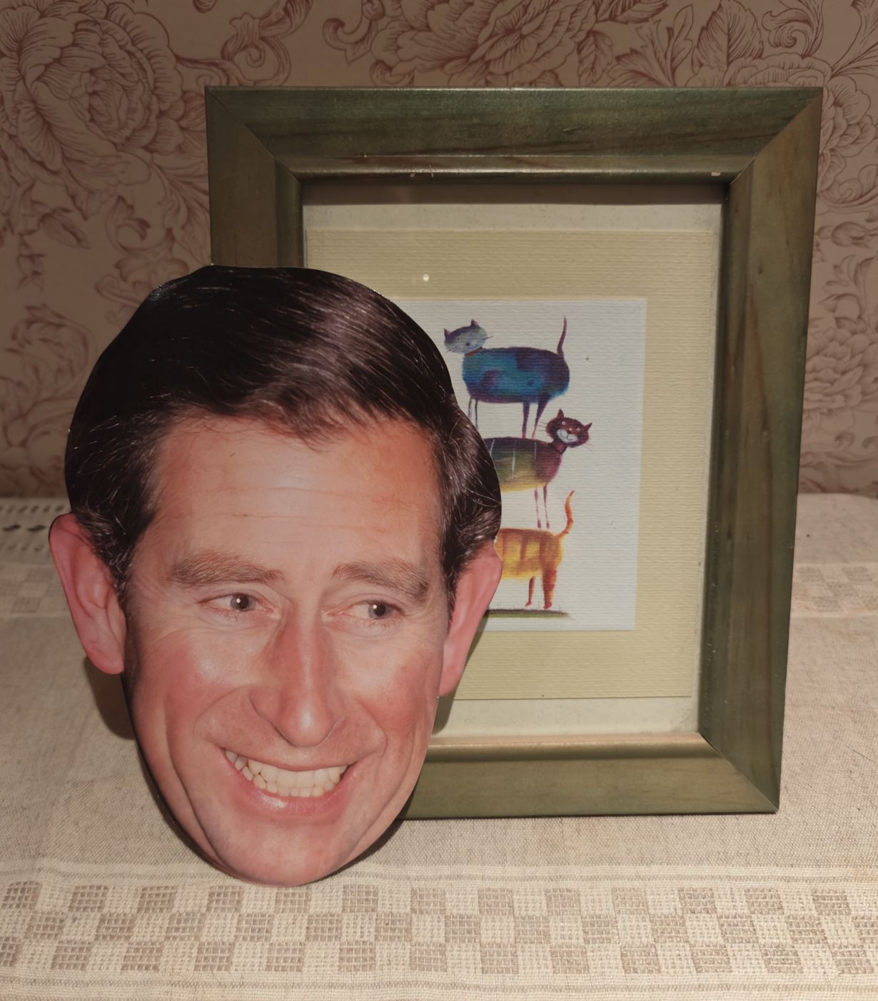 Esikoiseni sylikummi Anne lähetti kehyksissä olevan ihanan kissakortin asuessaan Lontoossa. Samasta kaupungista häneltä tuli myös prinssi Charlesin kuvalla varustettu kortti ja useampikin, mutta tämä yksilö on tallessa jääkaapin ovessa sen kääntöpuolen hauskan tekstin vuoksi.