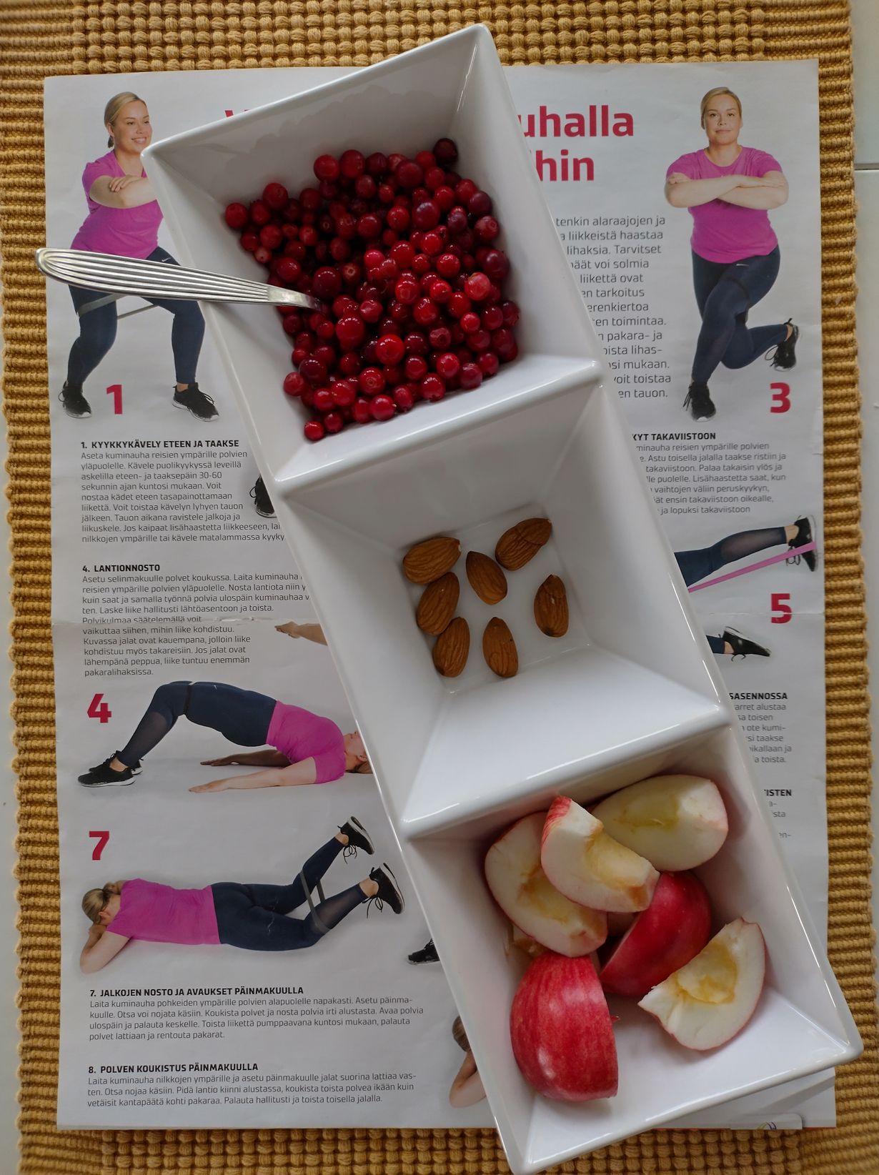 Hyvät syksyiset herkut. Omenat ja puolukat lähituotettua. Mantelit hieman kauempaa. Kaikki terveydelle hyväksi.