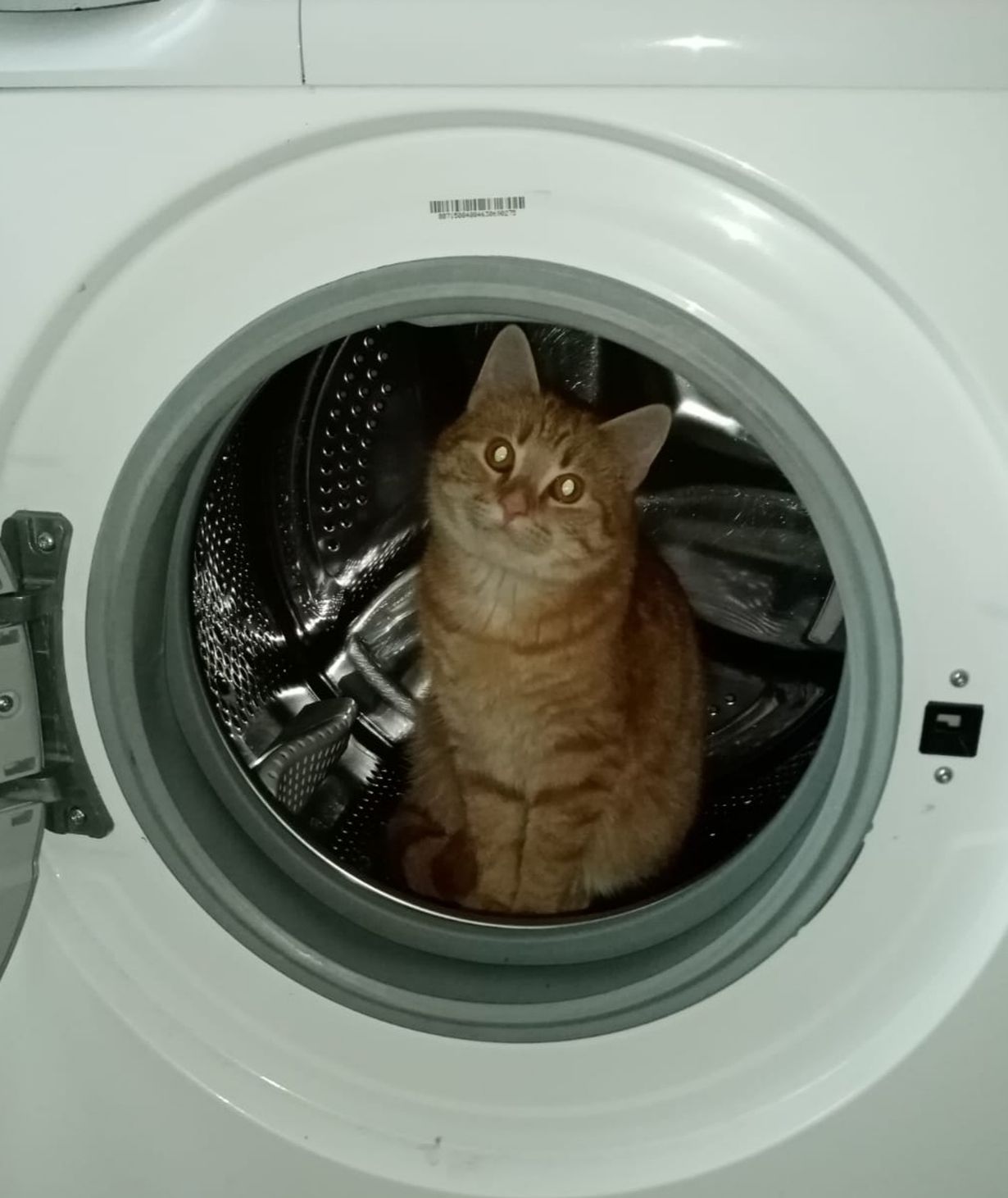 Nappi 7kk päätti tutustua pyykkikoneen toimintaan. Kenties kisun uusi yksiö.