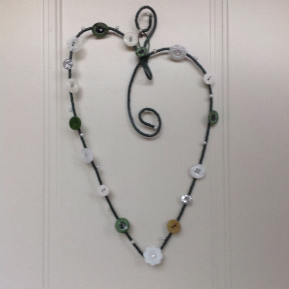 Sain idean tyttäreni rappukäytävän yhdestä ovesta. Heti kotiin penkomaan omia askarteluvarastoja. Sopiva rautalanka, nappeja ja helmiä löytyi ja syntyihän se oma sydän pienen puurtamisen tuloksena.