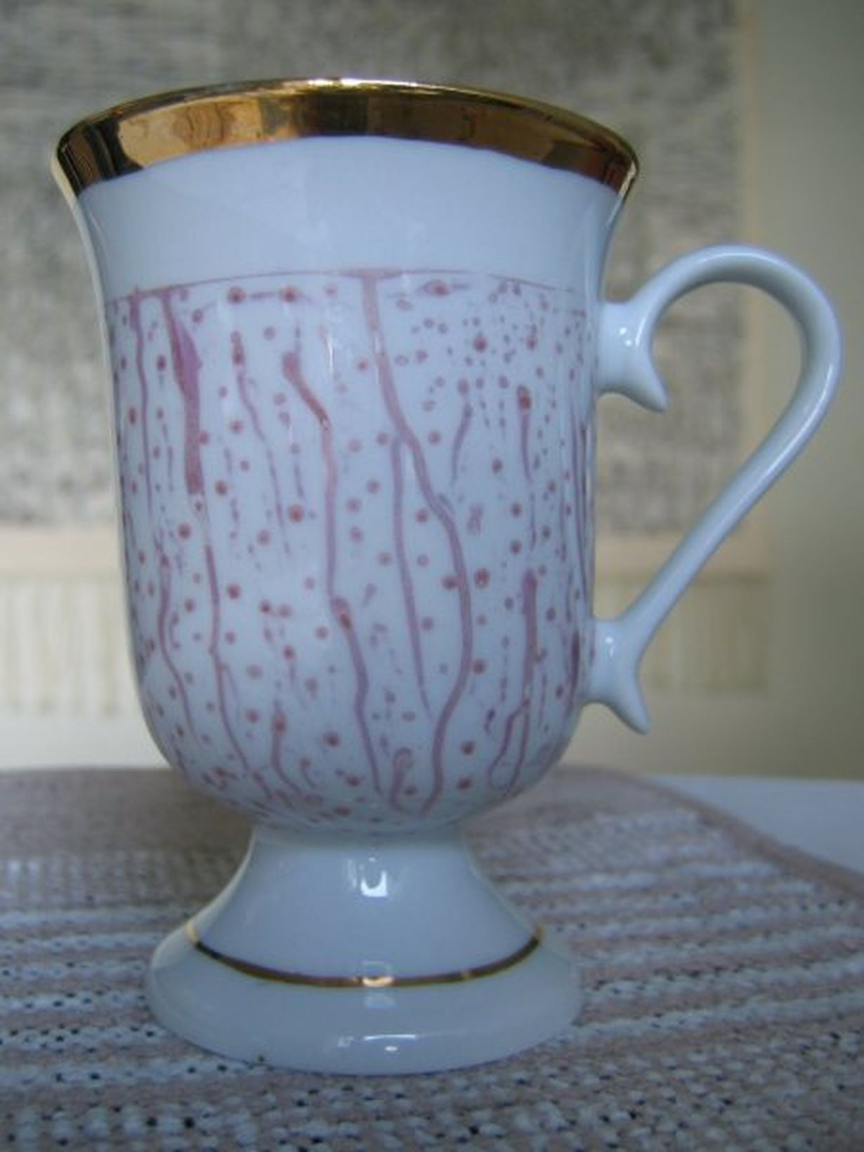 Kupin pohjassa on teksti ”E.M. -92”. Kiitos, E. M., kaunis maalaus kullattuine rantuineen!