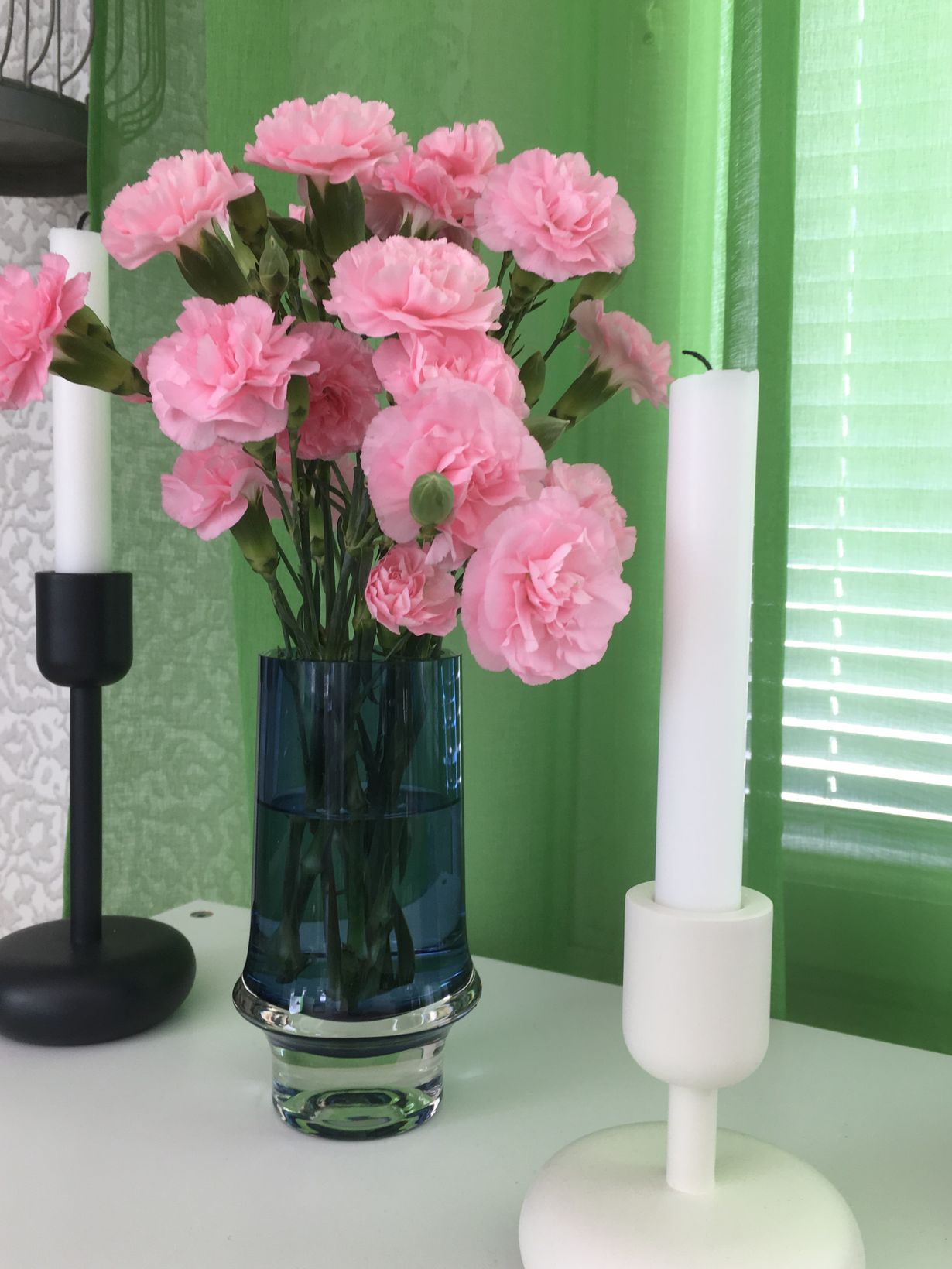 Ostan itselle aina siivouspäivänä kukkia.Tällä kertaa vaaleanpunaisia neilikoita vanhassa äidiltä saadussa Iittalan maljakossa