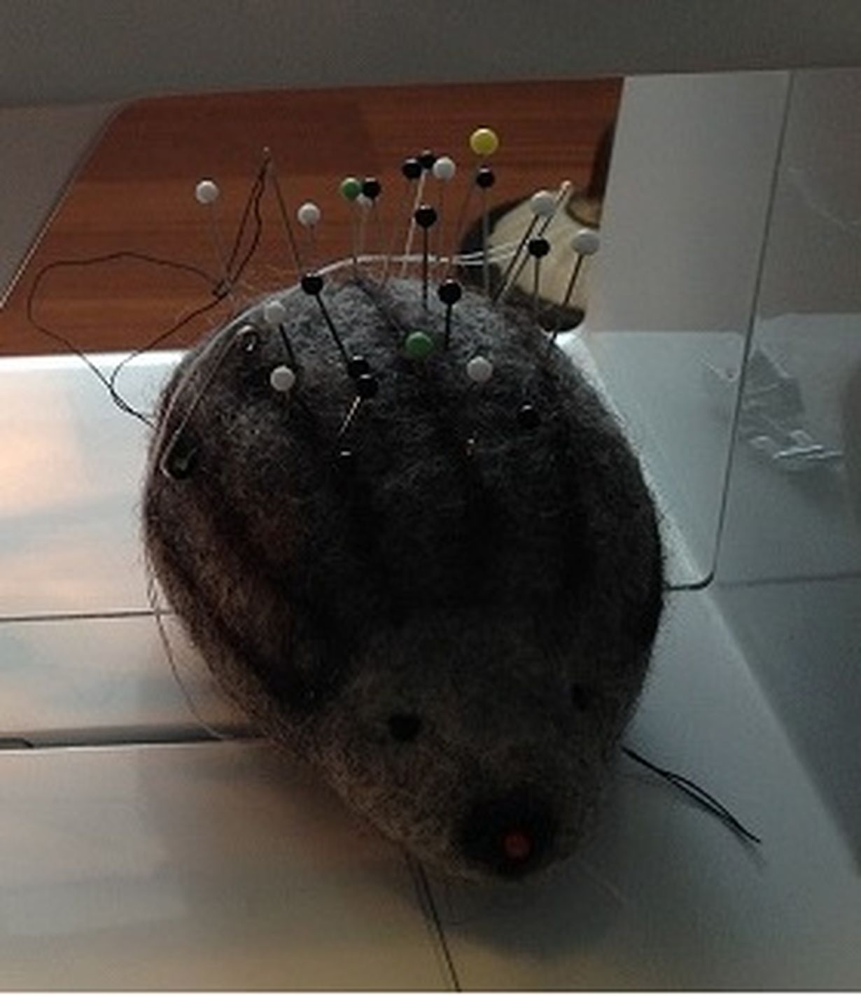Huovutetun siilin ostin neulatyynyksi muistaakseni Naisten Joulumessuilta. Olin kuullut, että nuppineulat pysyvät terävinä, kun ne tökkii aitoon villaan.