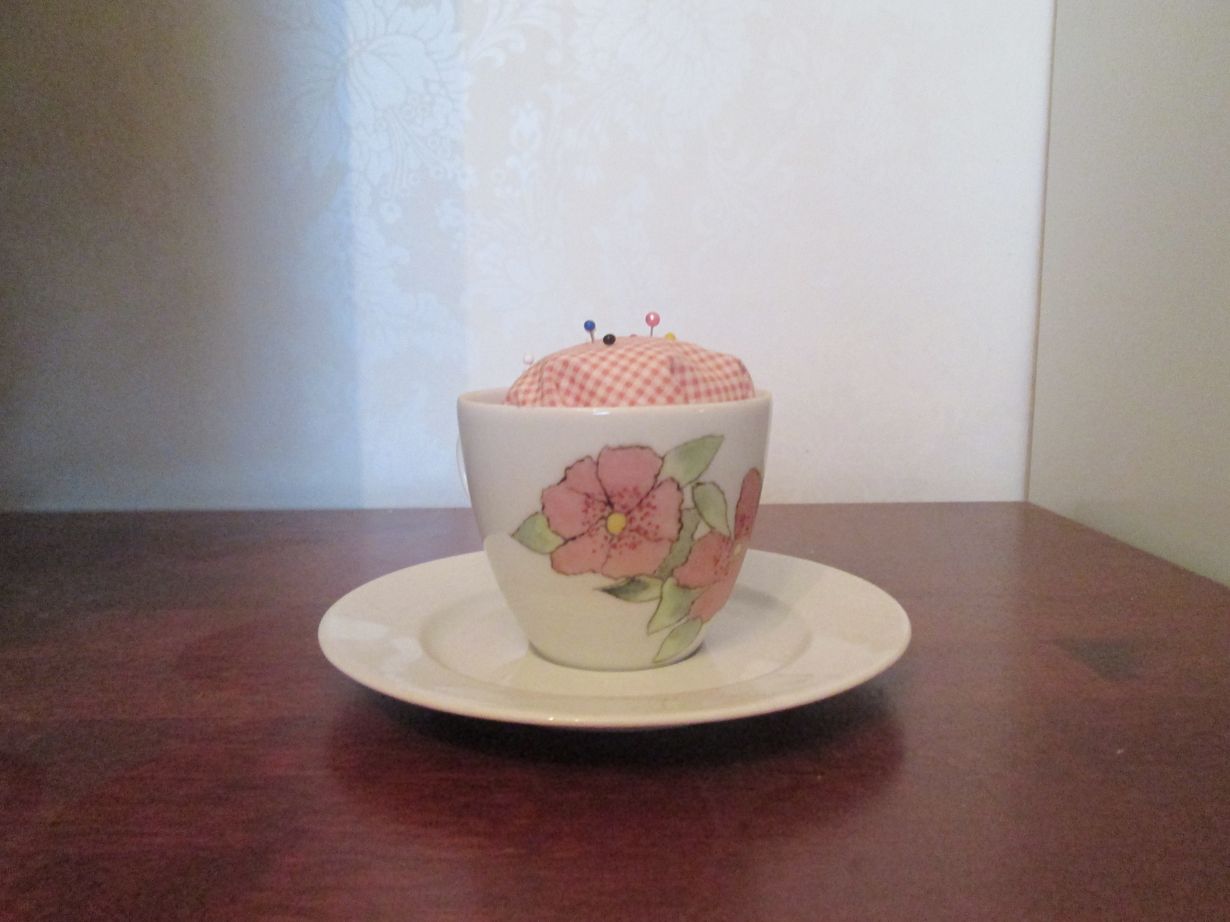 Ei löytynyt kirpparilta mieleistä kahvikuppia, päätin maalata itse. Poltettu posliiniuunissa kaksi kertaa. Sisällä tyynyssä on vanua ja kangas päällä.