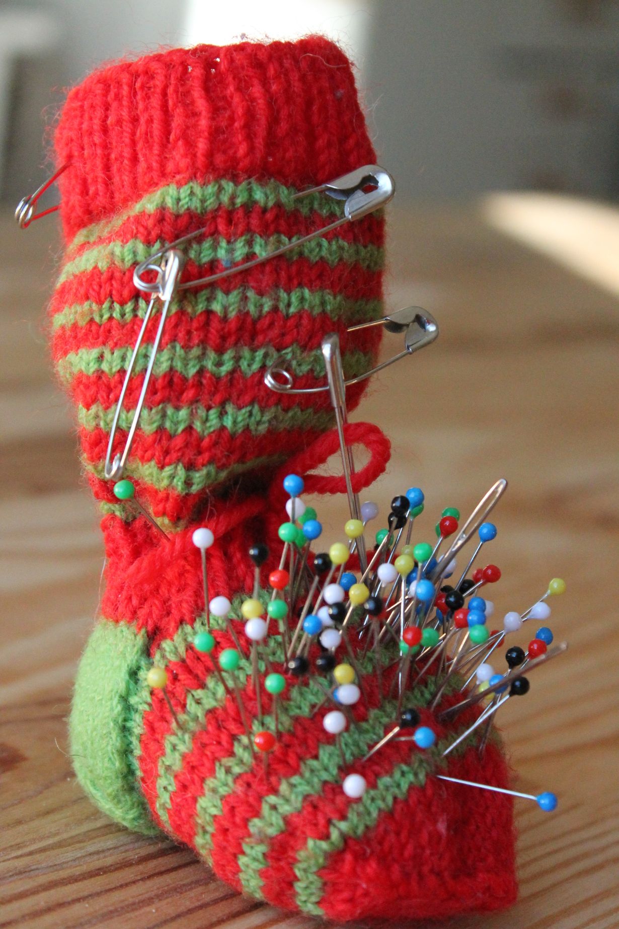 Tyttöjen vanha (25v.) tröllin sukka sai uusiokäytön neulatyynynä ja hyvin on palvellut vuosikymmeniä. Tyynyn saa hakaneulalla kiinni hihaan tai minne vain haluaa:)