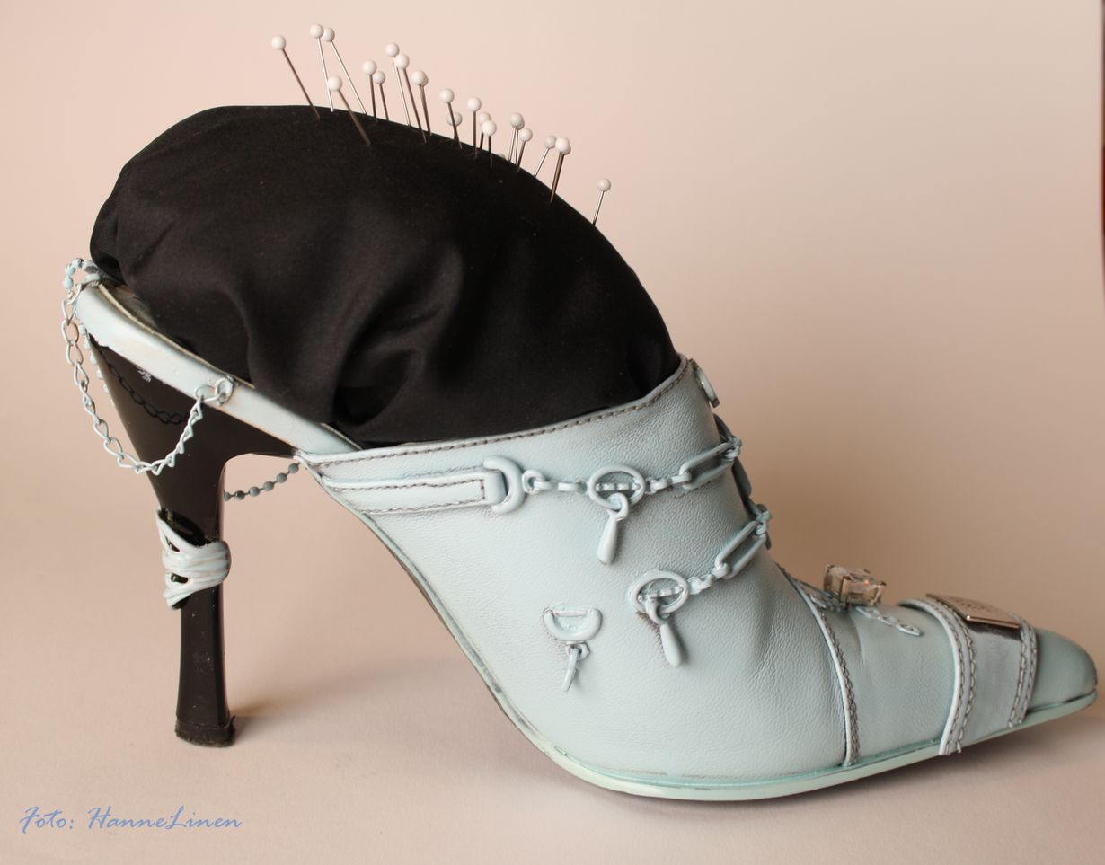 Vanhasta korkokengästä ja pumpulista tuunasin neulatyynyn. Liimasin kenkään vanhojen korujen osia ja maalasin sen kenkämaalilla siniseksi. Tähän tökkii neuloja ihan ilokseen.