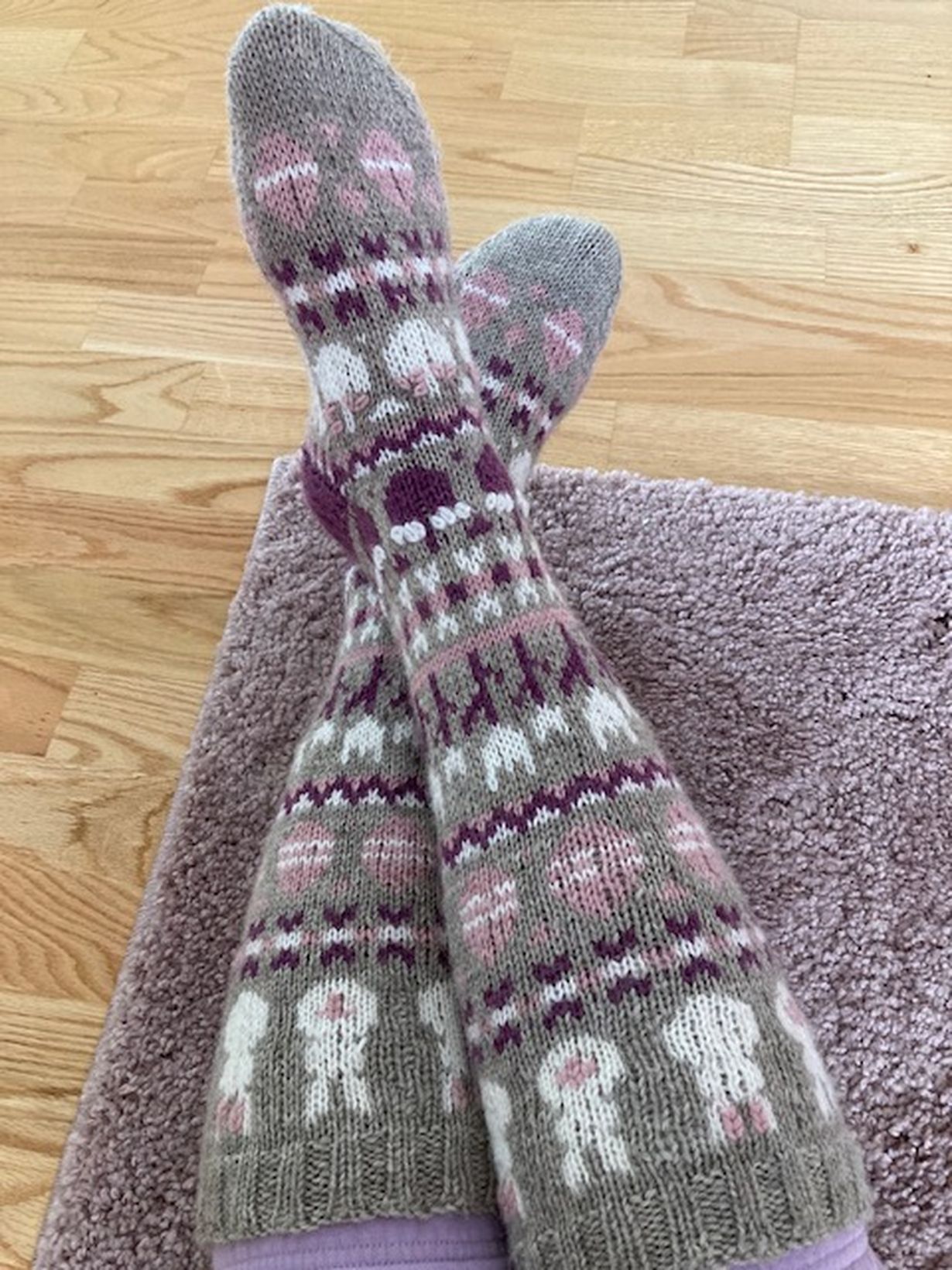 Koronan alkaessa osallistuin Novitan yhteisneulontaan. Ohje julkaistiin neljässä osassa maanantaisin ja Pääsiäiseksi valmistui nämä Pupujen juhla-nimiset sukat. Näitä neulottiin varmaan satoja silloin "yhdessä yksin" ja vieläkin kun katson sukkia mieleni valtaa ihana lämpö.