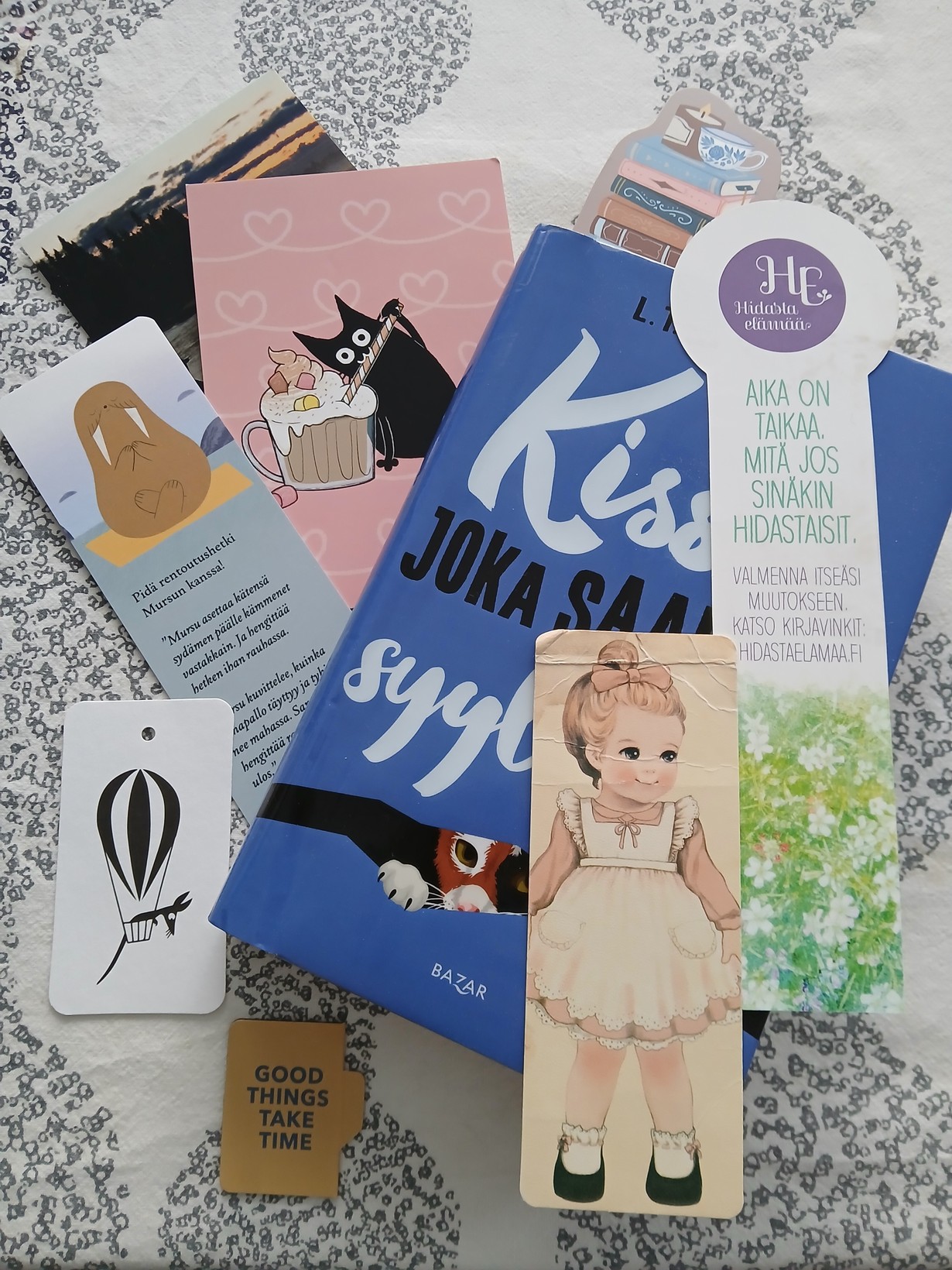 Mistä vain voi tulla kirjanmerkki. Suosikkina säilynyt mekki joka muistuttaa hidastamaan ja kerran kirpputori reissulta mukaan tarttunut kiiltokuvatyttö.