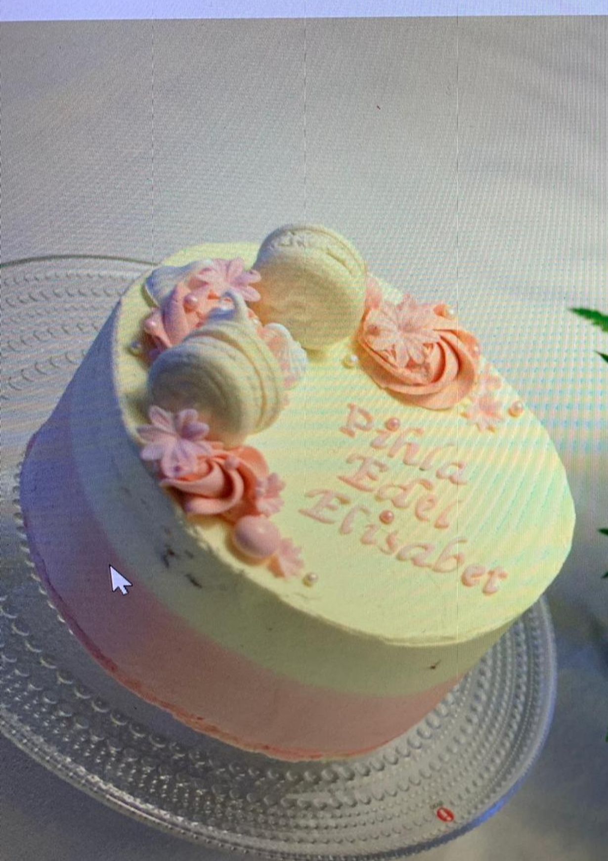 Lapsenlapsen nimiäiskakku. Juhlaa edeltävänä päivänä jouduin koronakaranteeniin altistumisen vuoksi, enkä päässyt osallistumaan pikkuisen juhlaan, mutta kakku oli kaunis ja näin ainakin kuvan siitä!