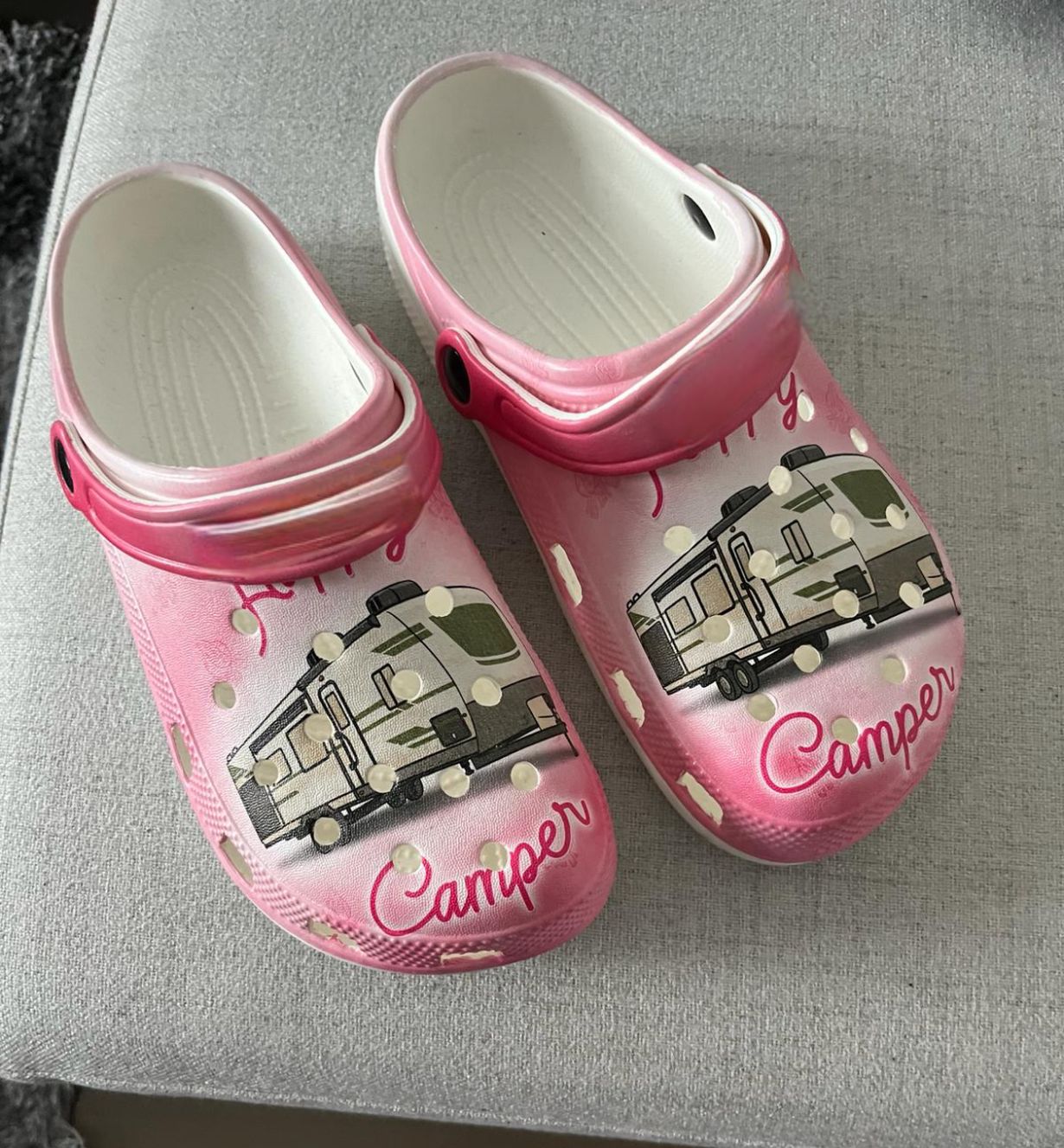 Karavaanarille karavaanarin muovitossut! Kantapään takaata menevässä lenkissä on oma nimeni (kuvaa varten sutattu).
