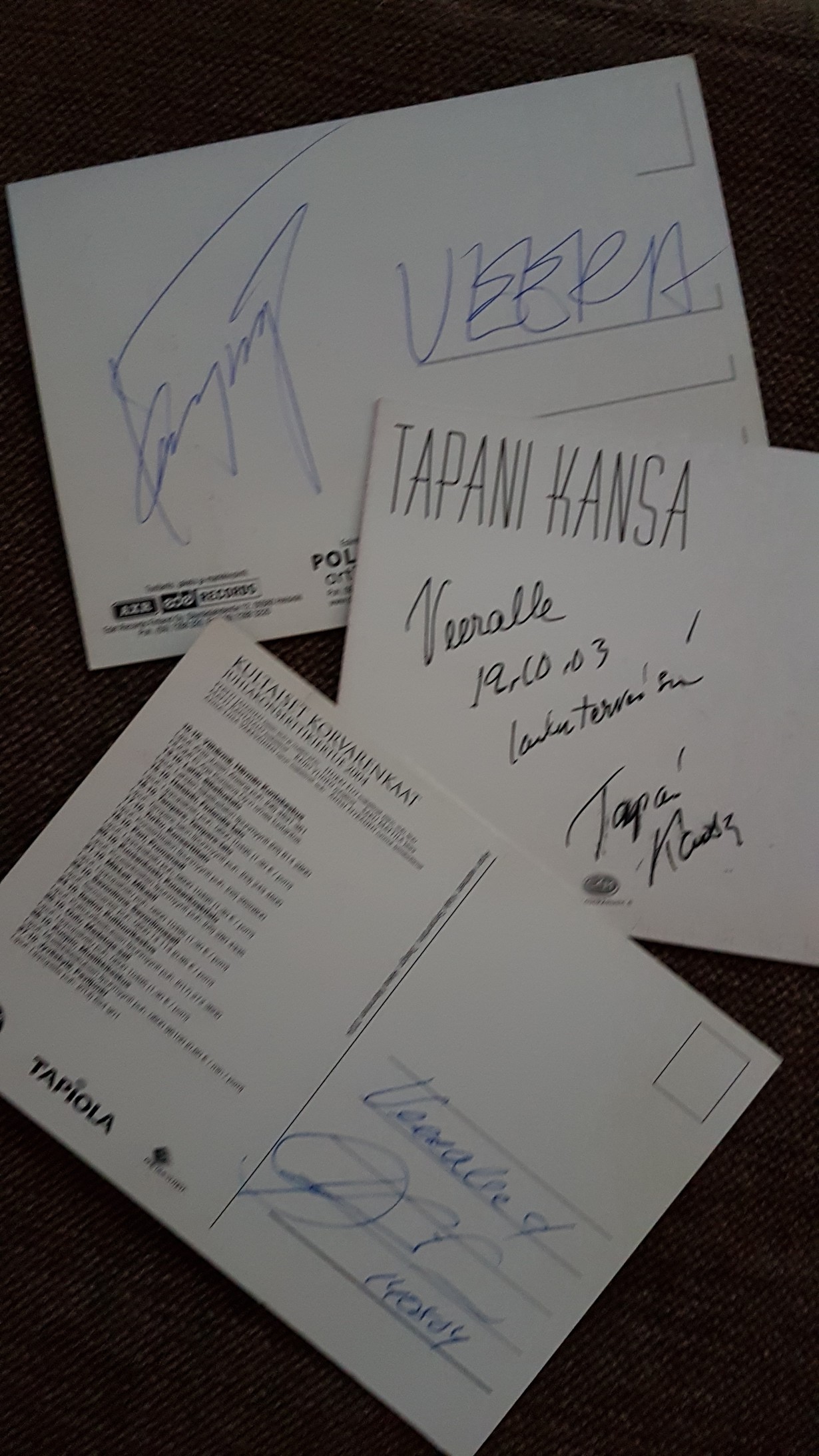 Harrastamme mieheni kanssa lavatansseja. Alkuaikoina pyysimme illan esiintyjiltä nimmareita tyttärillemme. Tässä kolme kovaa nimeä: Kari Tapio, Tapani Kansa ja Arja Koriseva.